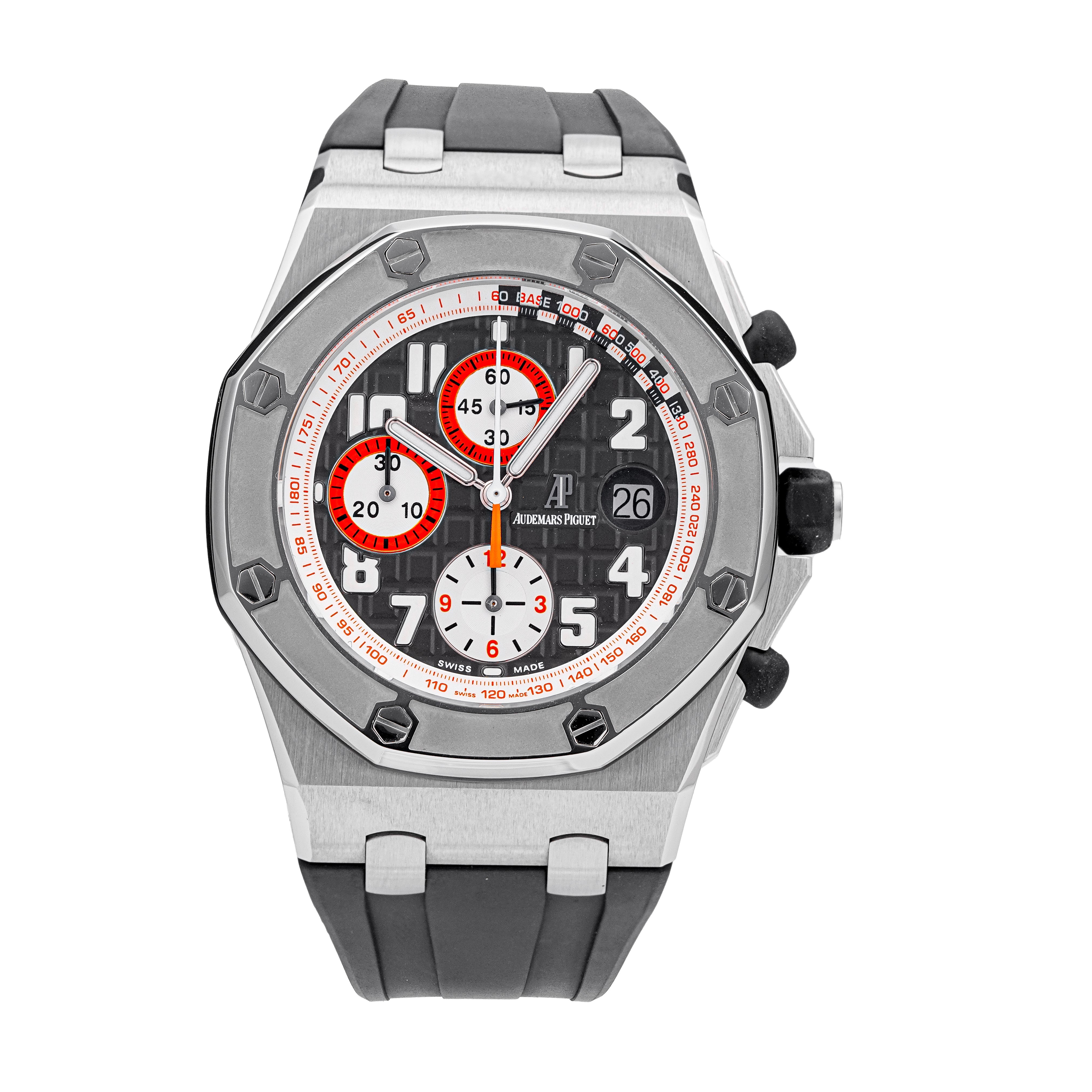 This Audemars Piguet Royal Oak Offshore 26175ST.OO.D003CU.01 has a grey arabic dial and a rubber strap. This Audemars Piguet has undergone a thorough inspection of accuracy, functionality and condition at our Audemars Piguet certified service centre to determine the level of reconditioning required to meet our strict standards. It has also been checked against our records to ensure authenticity. All our watches have a 24-month warranty for your peace of mind.