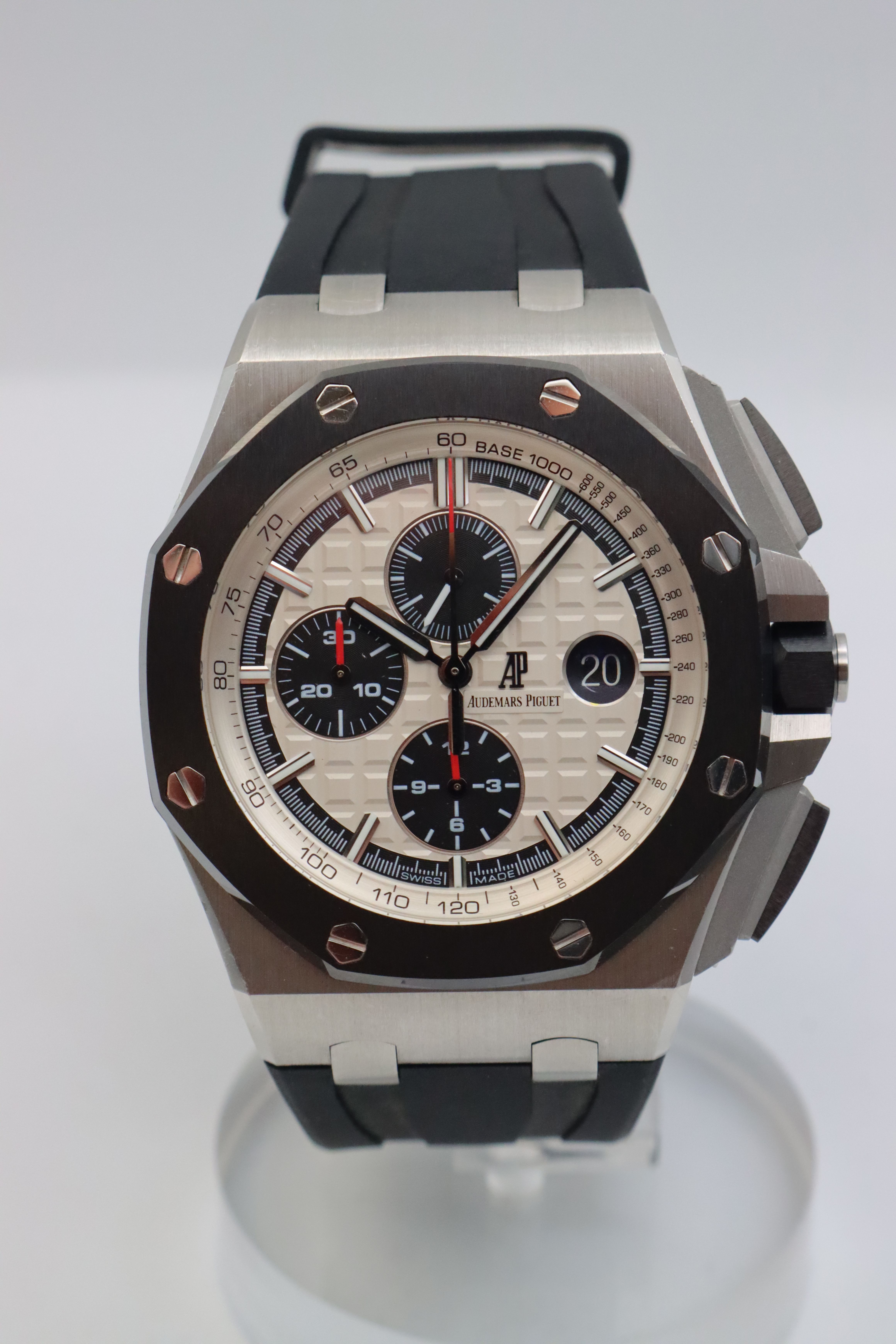 This Audemars Piguet Royal Oak Offshore 26400SO.OO.A002CA.01 has a silver baton dial and a rubber strap. This Audemars Piguet has undergone a thorough inspection of accuracy, functionality and condition at our Audemars Piguet certified service centre to determine the level of reconditioning required to meet our strict standards. It has also been checked against our records to ensure authenticity. All our watches have a 24-month warranty for your peace of mind.