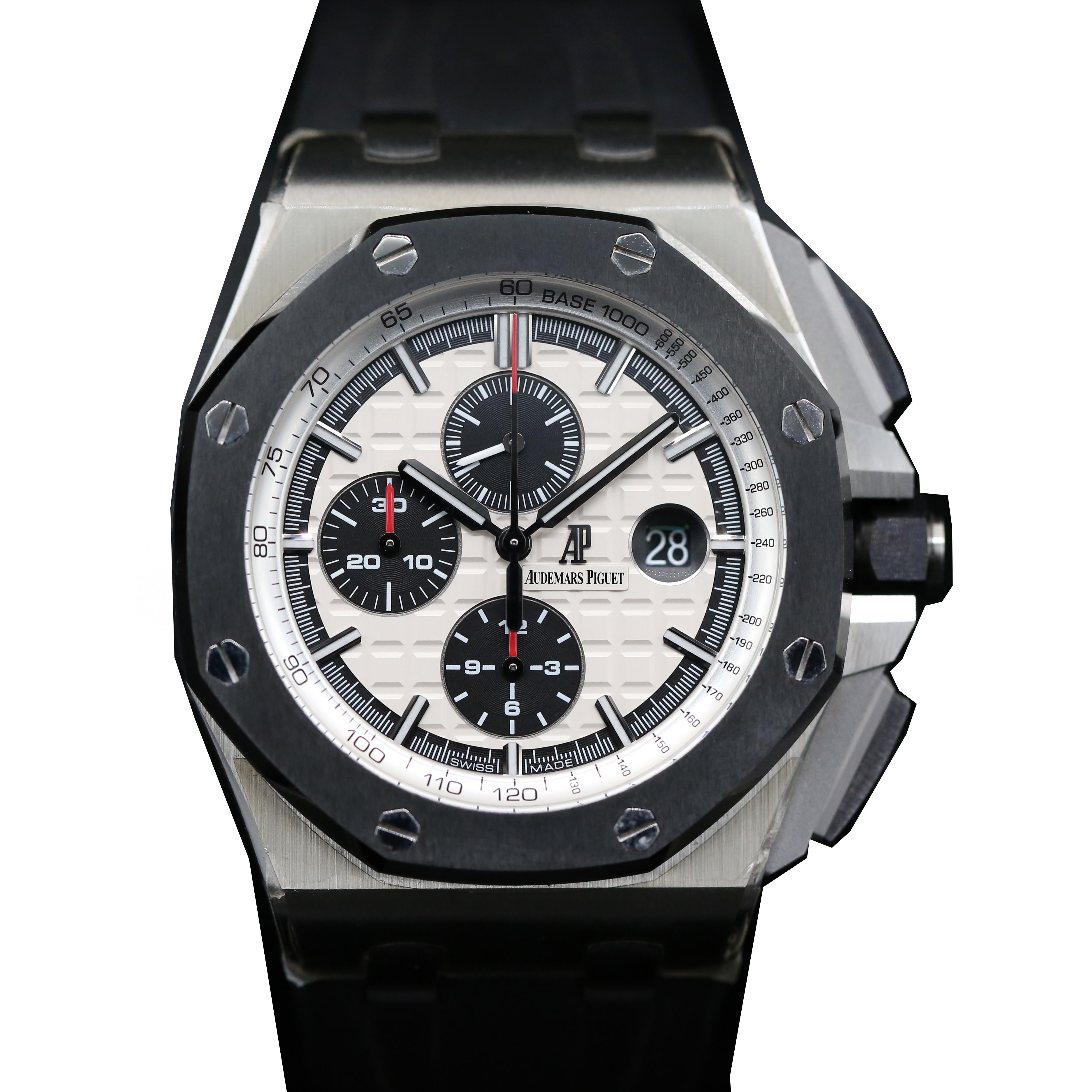 This Audemars Piguet Royal Oak Offshore 26400SO.OO.A002CA.01 has a silver baton dial and a rubber strap. This Audemars Piguet has undergone a thorough inspection of accuracy, functionality and condition at our Audemars Piguet certified service centre to determine the level of reconditioning required to meet our strict standards. It has also been checked against our records to ensure authenticity. All our watches have a 24-month warranty for your peace of mind.