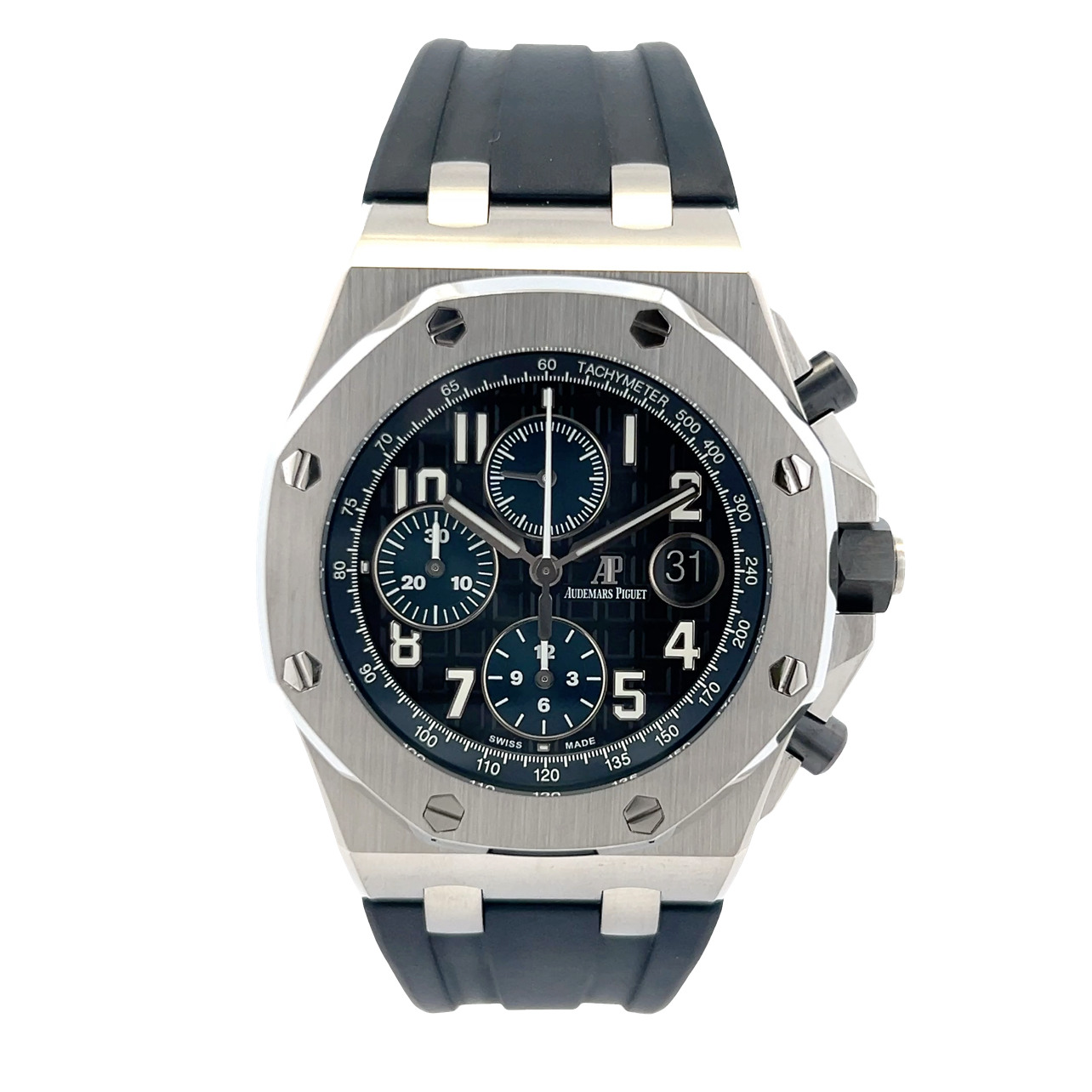 This Audemars Piguet Royal Oak Offshore 26470ST.OO.A027CA.01 has a blue arabic dial and a rubber strap. This Audemars Piguet has undergone a thorough inspection of accuracy, functionality and condition at our Audemars Piguet certified service centre to determine the level of reconditioning required to meet our strict standards. It has also been checked against our records to ensure authenticity. Our watches have a 24-month warranty for your peace of mind, in conjunction with any remaining manufacturer’s warranty from new or from service.