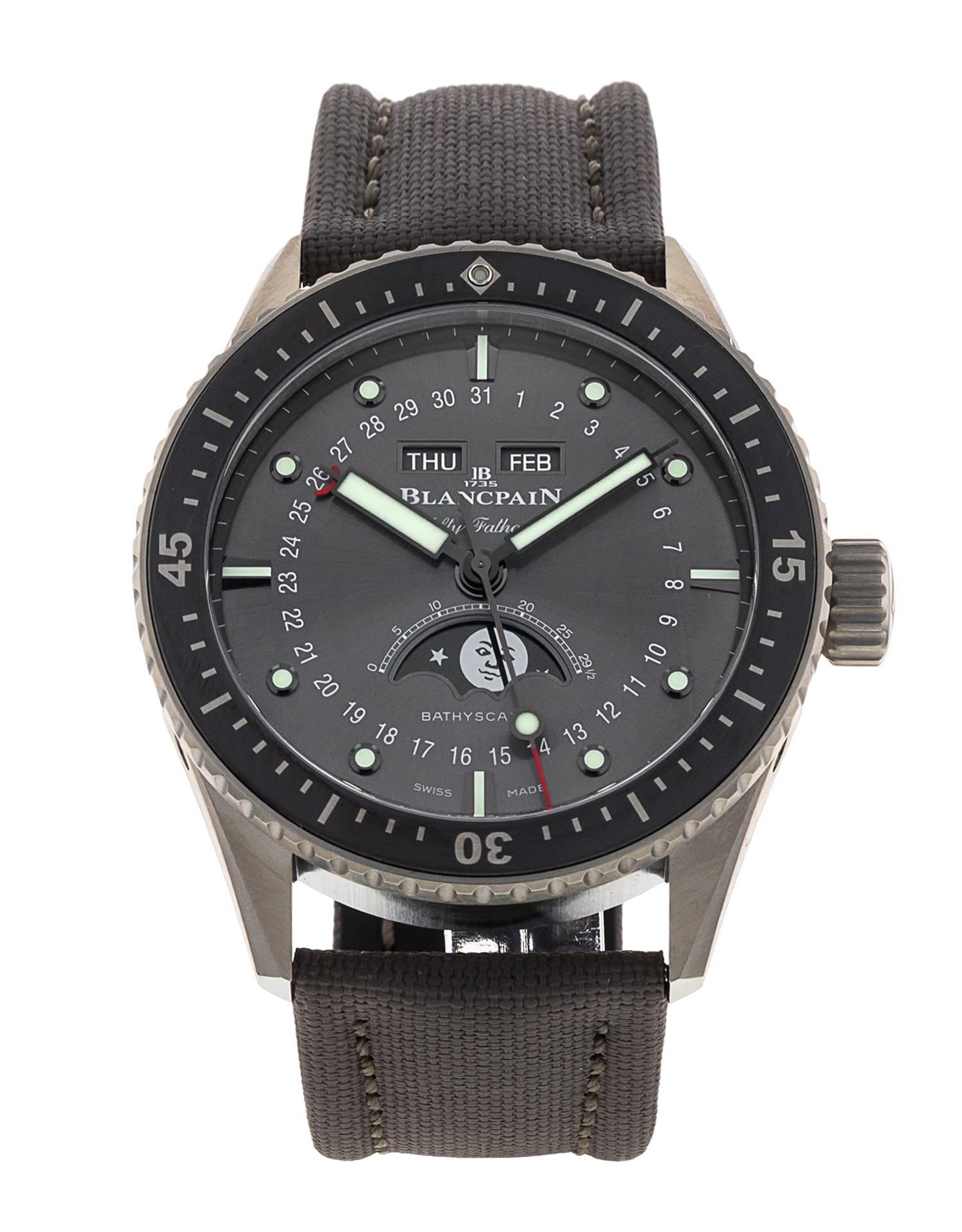 This Blancpain Fifty Fathoms 5054-1210-G52A has a anthracite dial and a fabric strap. This Blancpain has undergone a thorough inspection of water resistance, accuracy, functionality and condition to determine the level of reconditioning required to meet our strict standards. It has also been referenced against technical documents and manufacturer records where available to ensure authenticity and a clean history. All our watches have a 24-month warranty for your peace of mind.