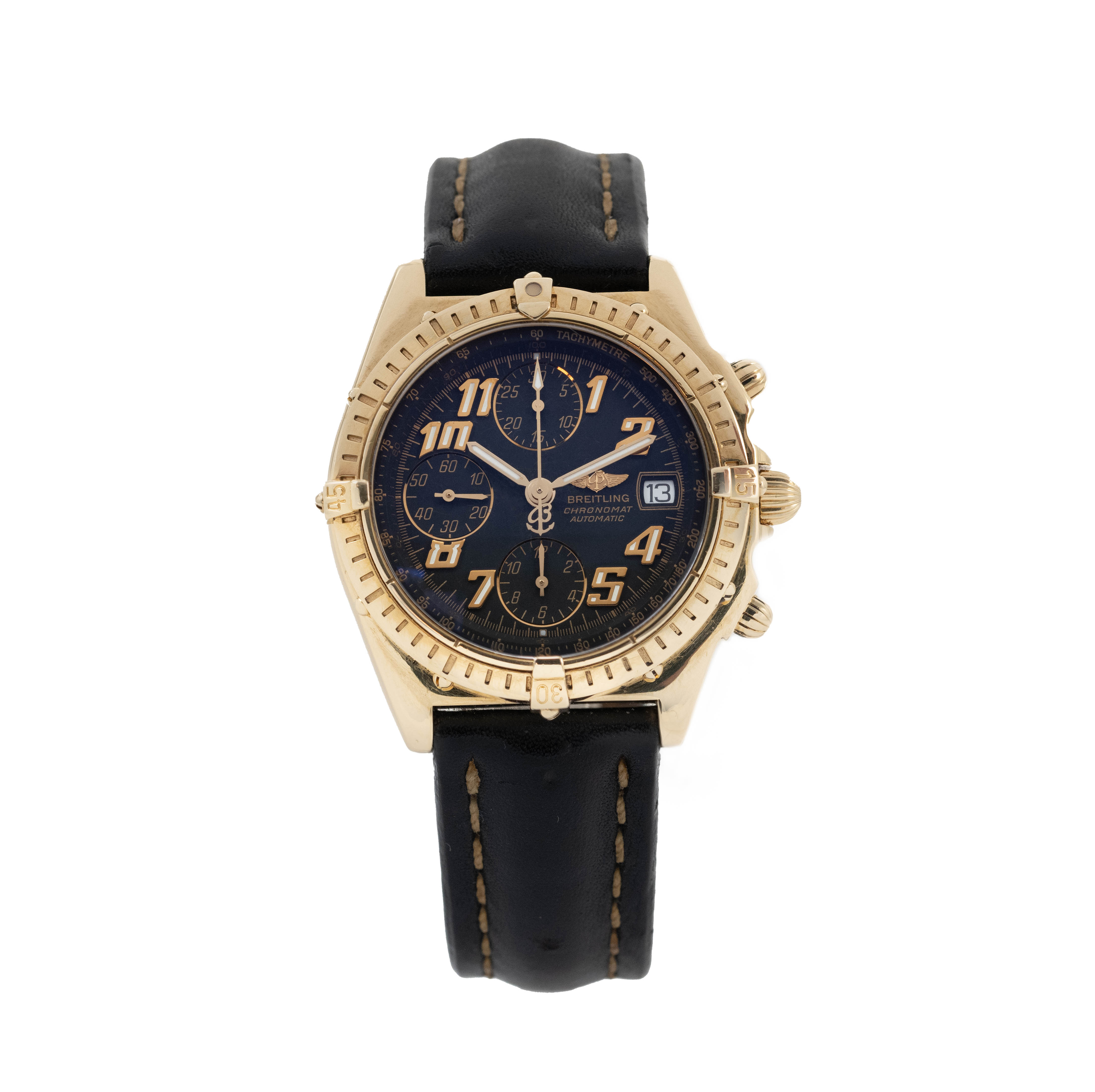 This Breitling Chronomat B13050.1 has a black arabic dial and a leather strap. This Breitling has undergone a thorough inspection of water resistance, accuracy, functionality and condition to determine the level of reconditioning required to meet our strict standards. It has also been referenced against technical documents and manufacturer records where available to ensure authenticity and a clean history. All our watches have a 24-month warranty for your peace of mind.