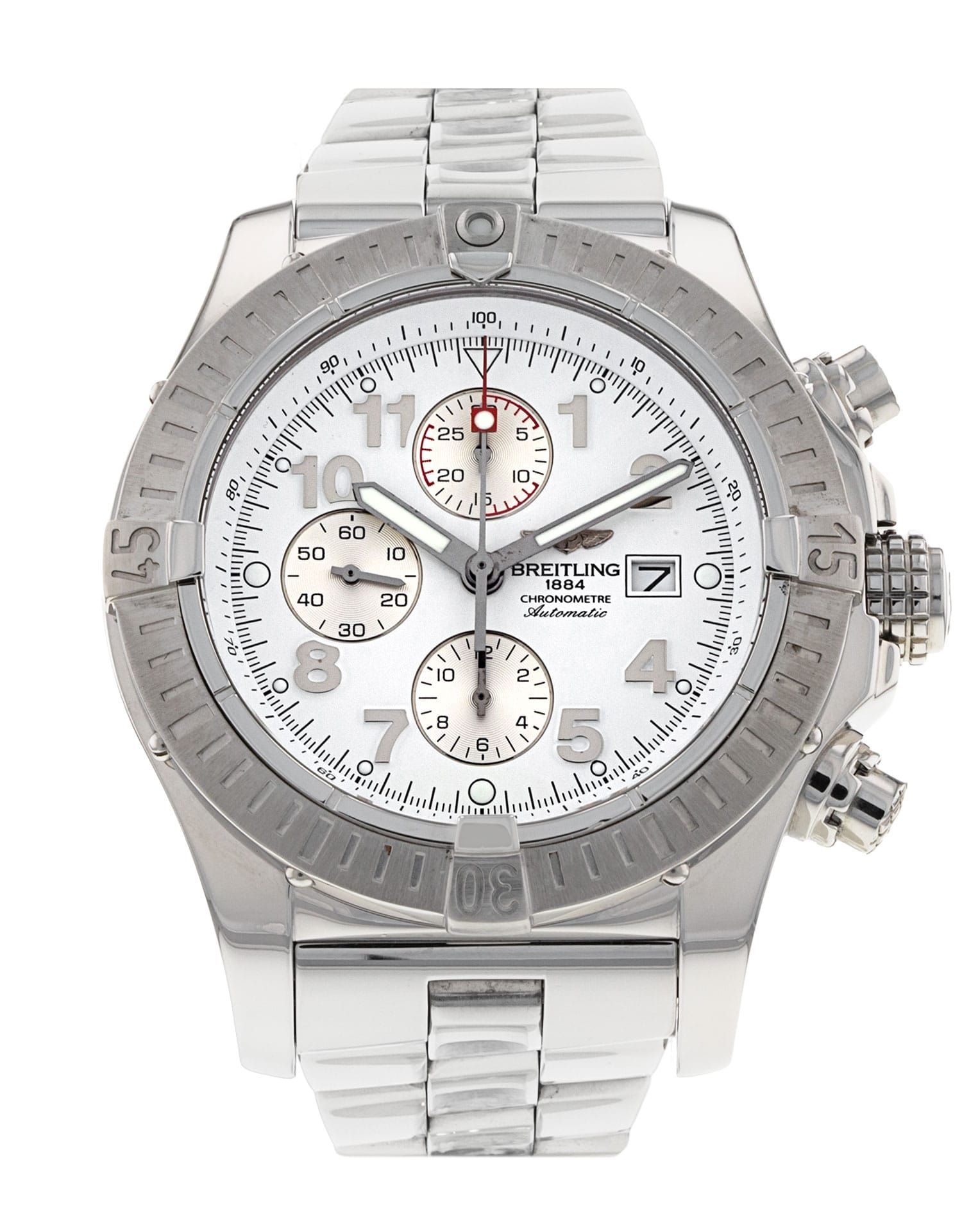 This Breitling Super Avenger A13370 has a white arabic dial and a bracelet strap. This Breitling has undergone a thorough inspection of water resistance, accuracy, functionality and condition to determine the level of reconditioning required to meet our strict standards. It has also been referenced against technical documents and manufacturer records where available to ensure authenticity and a clean history. All our watches have a 24-month warranty for your peace of mind.