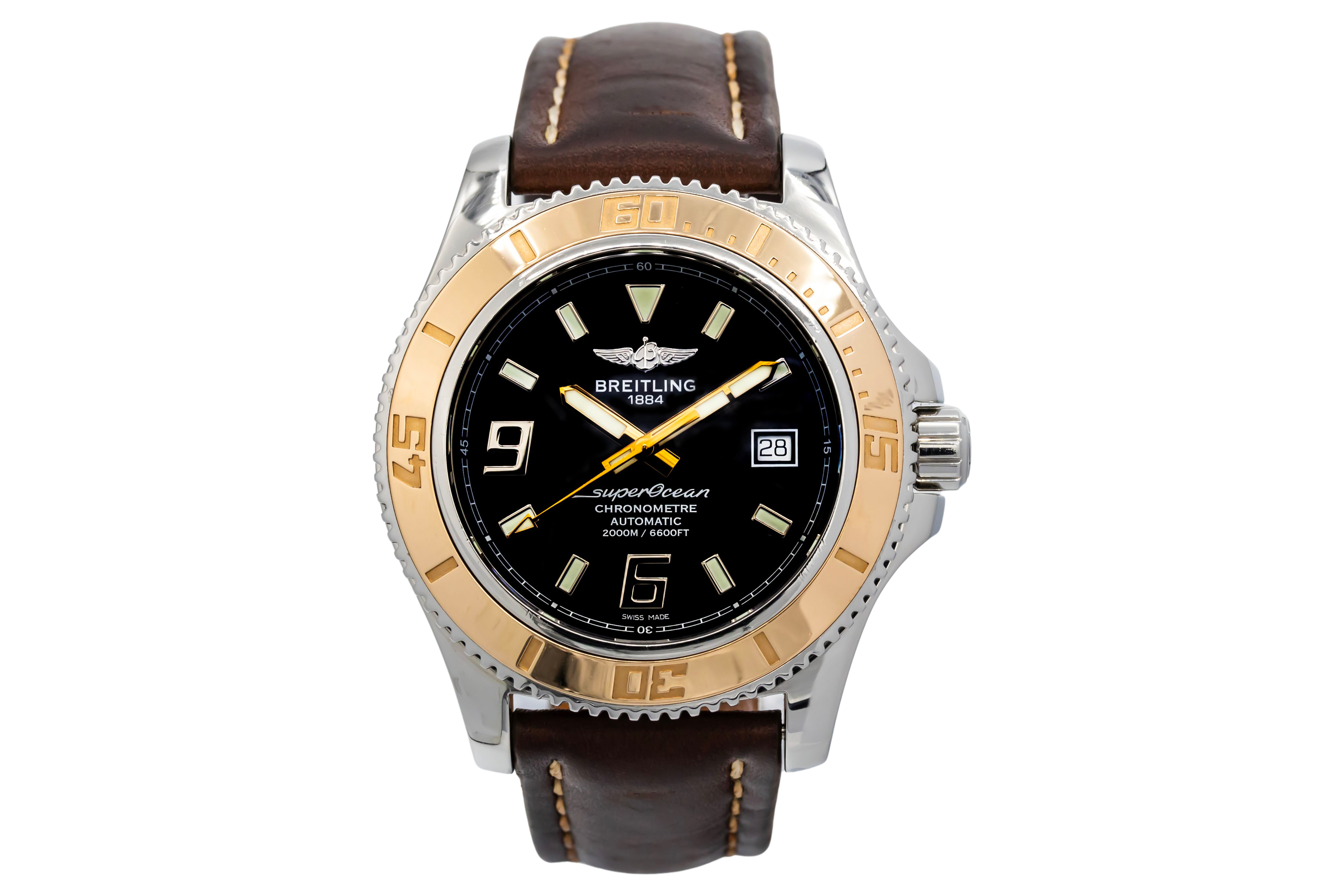This Breitling SuperOcean C17391 has a black dial and a leather strap. This Breitling has undergone a thorough inspection of water resistance, accuracy, functionality and condition to determine the level of reconditioning required to meet our strict standards. It has also been referenced against technical documents and manufacturer records where available to ensure authenticity and a clean history. All our watches have a 24-month warranty for your peace of mind.