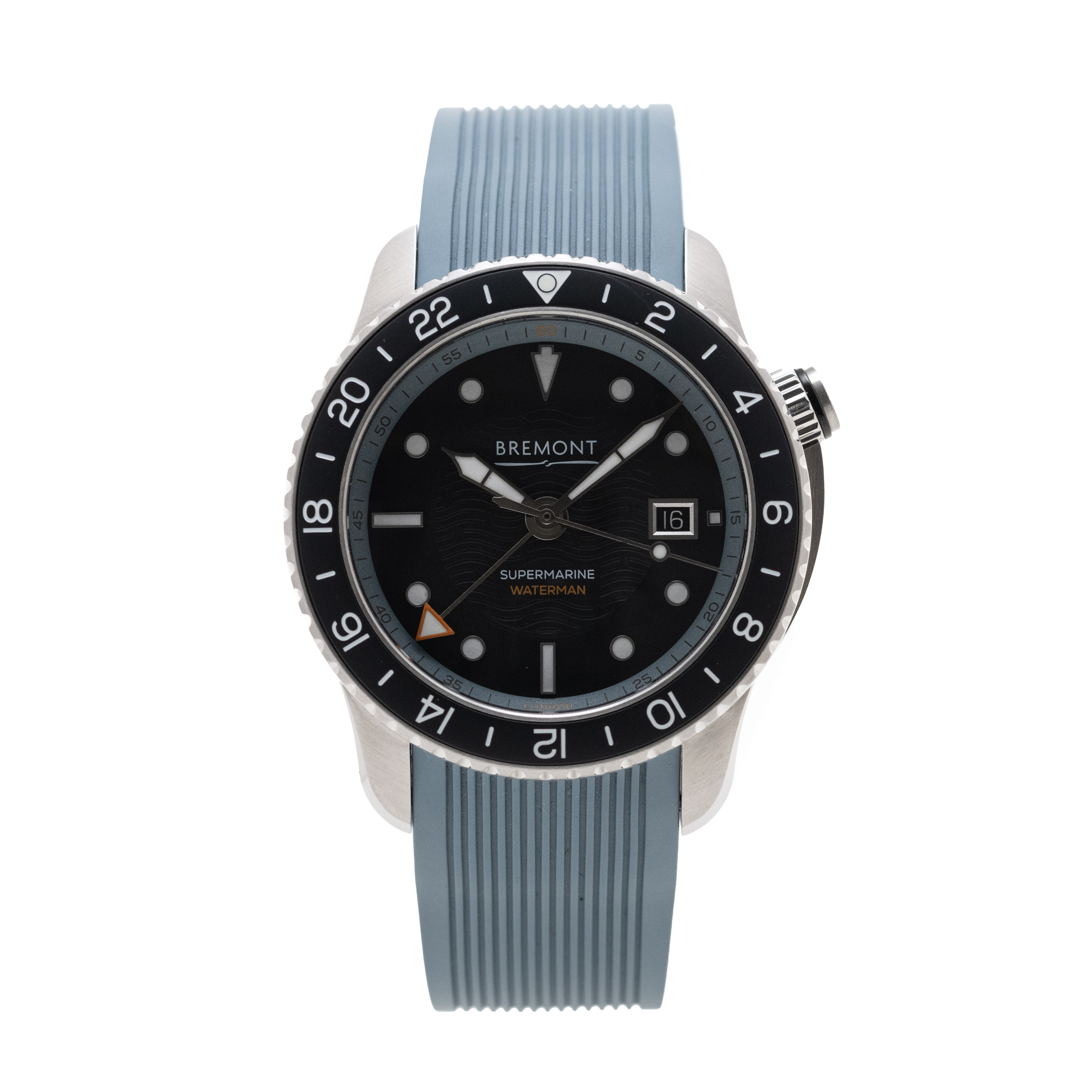 This Bremont Supermarine WATERMAN-APEX-R-S has a black dial and a rubber strap. This Bremont has undergone a thorough inspection of water resistance, accuracy, functionality and condition to determine the level of reconditioning required to meet our strict standards. It has also been referenced against technical documents and manufacturer records where available to ensure authenticity and a clean history. All our watches have a 24-month warranty for your peace of mind.