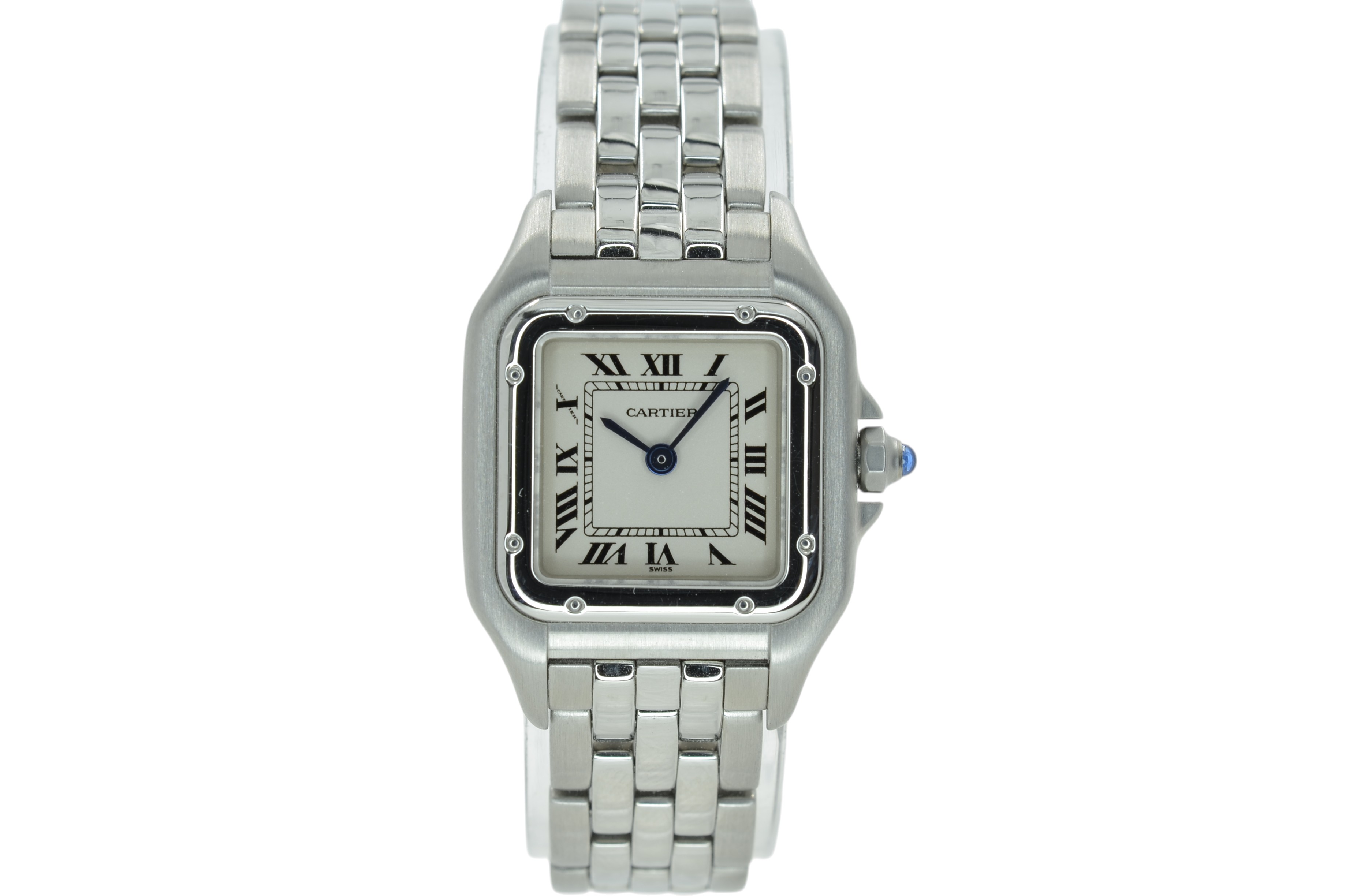 This Cartier Panthere W25033P5 has a silver roman numeral dial and a bracelet strap. This Cartier has undergone a thorough inspection of accuracy, functionality and condition at our Cartier certified service centre to determine the level of reconditioning required to meet our strict standards. It has also been checked against our records to ensure authenticity. All our watches have a 24-month warranty for your peace of mind.