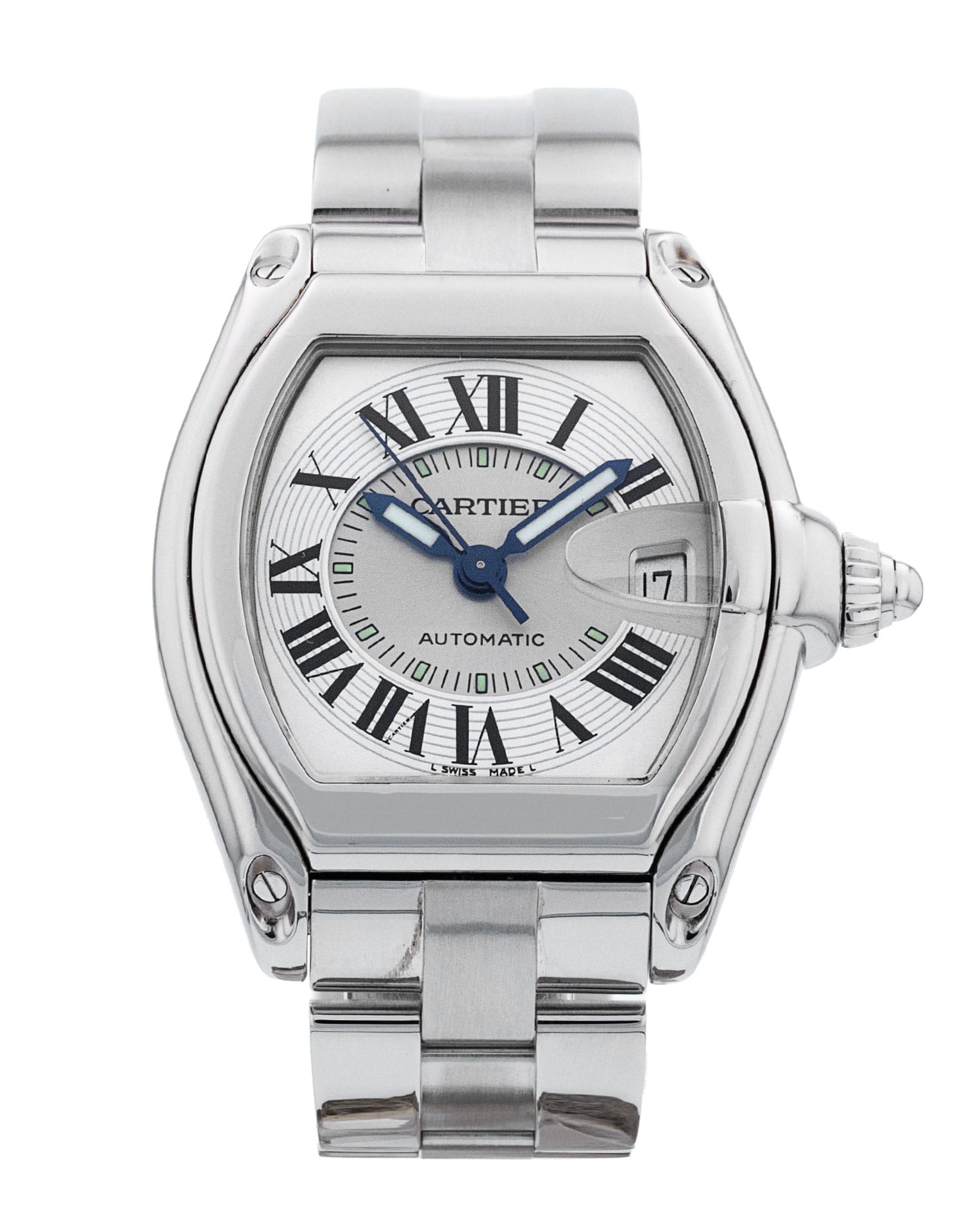 This Cartier Roadster W62000V3 has a silver roman numeral dial and a bracelet strap. This Cartier has undergone a thorough inspection of accuracy, functionality and condition at our Cartier certified service centre to determine the level of reconditioning required to meet our strict standards. It has also been checked against our records to ensure authenticity. All our watches have a 24-month warranty for your peace of mind.