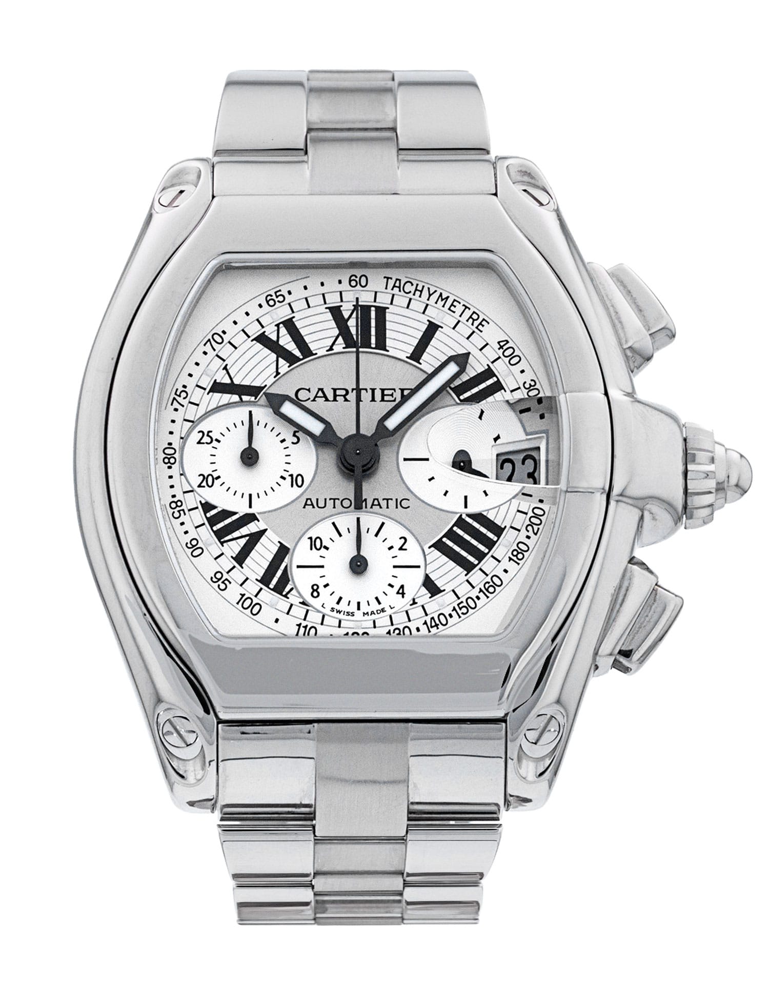 This Cartier Roadster W62006X6 has a silver roman numeral dial and a bracelet strap. This Cartier has undergone a thorough inspection of accuracy, functionality and condition at our Cartier certified service centre to determine the level of reconditioning required to meet our strict standards. It has also been checked against our records to ensure authenticity. All our watches have a 24-month warranty for your peace of mind.