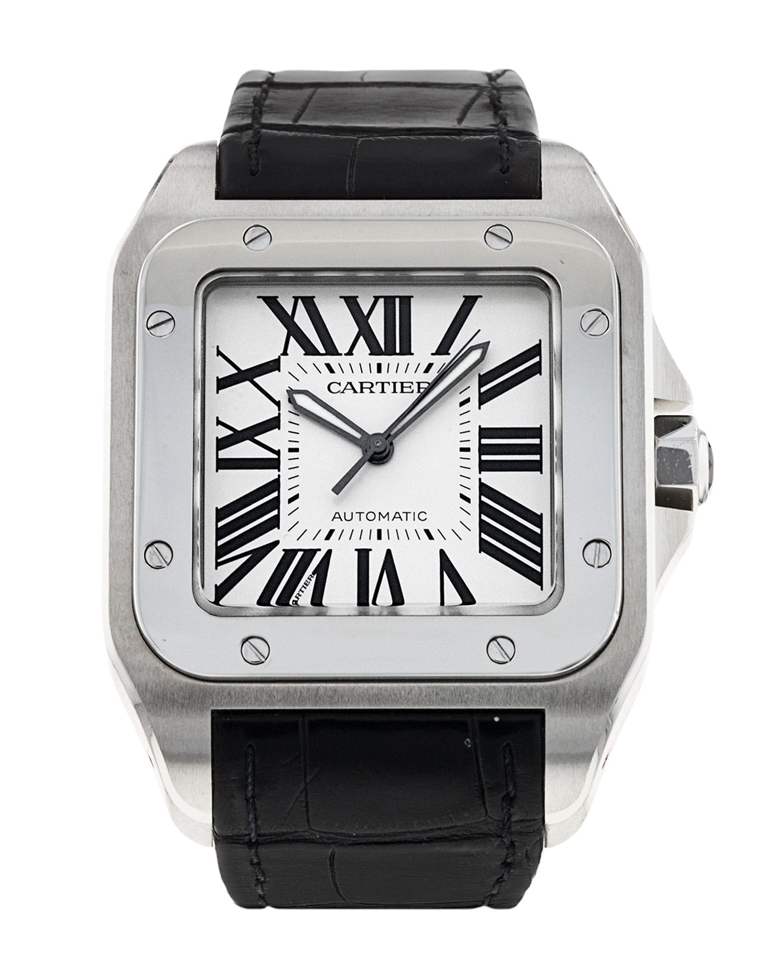 This Cartier Santos 100 W20073X8 has a silver roman numeral dial and a leather strap. This Cartier has undergone a thorough inspection of accuracy, functionality and condition at our Cartier certified service centre to determine the level of reconditioning required to meet our strict standards. It has also been checked against our records to ensure authenticity. All our watches have a 24-month warranty for your peace of mind.