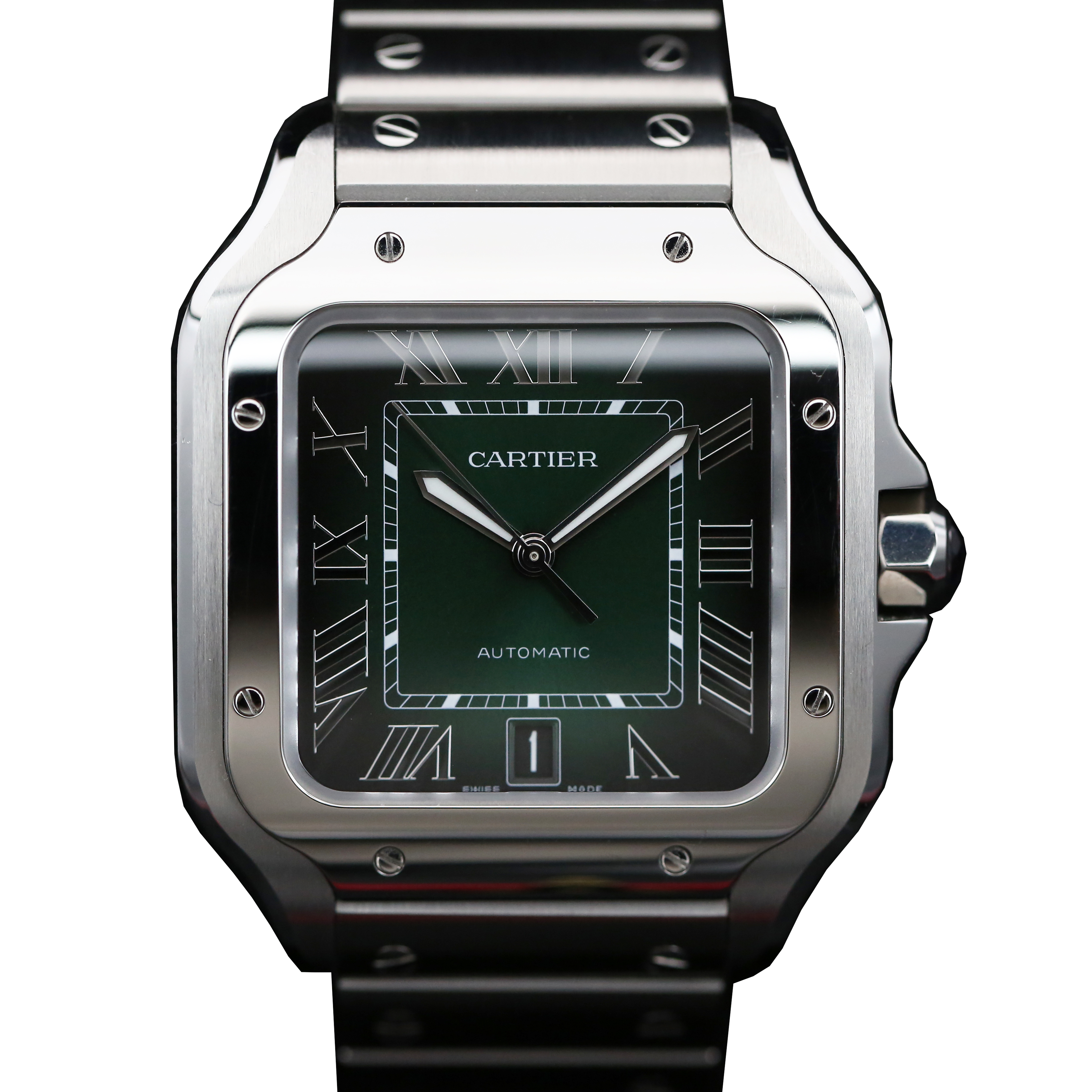 This Cartier Santos De Cartier WSSA0062 has a green roman numeral dial and a bracelet strap. This Cartier has undergone a thorough inspection of accuracy, functionality and condition at our Cartier certified service centre to determine the level of reconditioning required to meet our strict standards. It has also been checked against our records to ensure authenticity. Our watches have a 24-month warranty for your peace of mind, in conjunction with any remaining manufacturer’s warranty from new or from service.