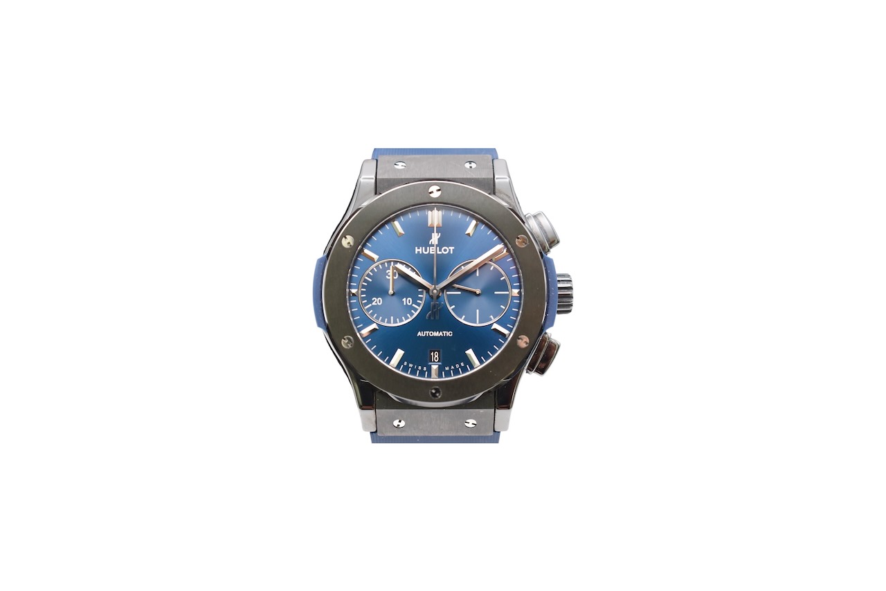 This Hublot Classic Fusion 521.CM.7170.LR has a blue baton dial and a rubber strap. This Hublot has undergone a thorough inspection of water resistance, accuracy, functionality and condition to determine the level of reconditioning required to meet our strict standards. It has also been referenced against technical documents and manufacturer records where available to ensure authenticity and a clean history. All our watches have a 24-month warranty for your peace of mind.