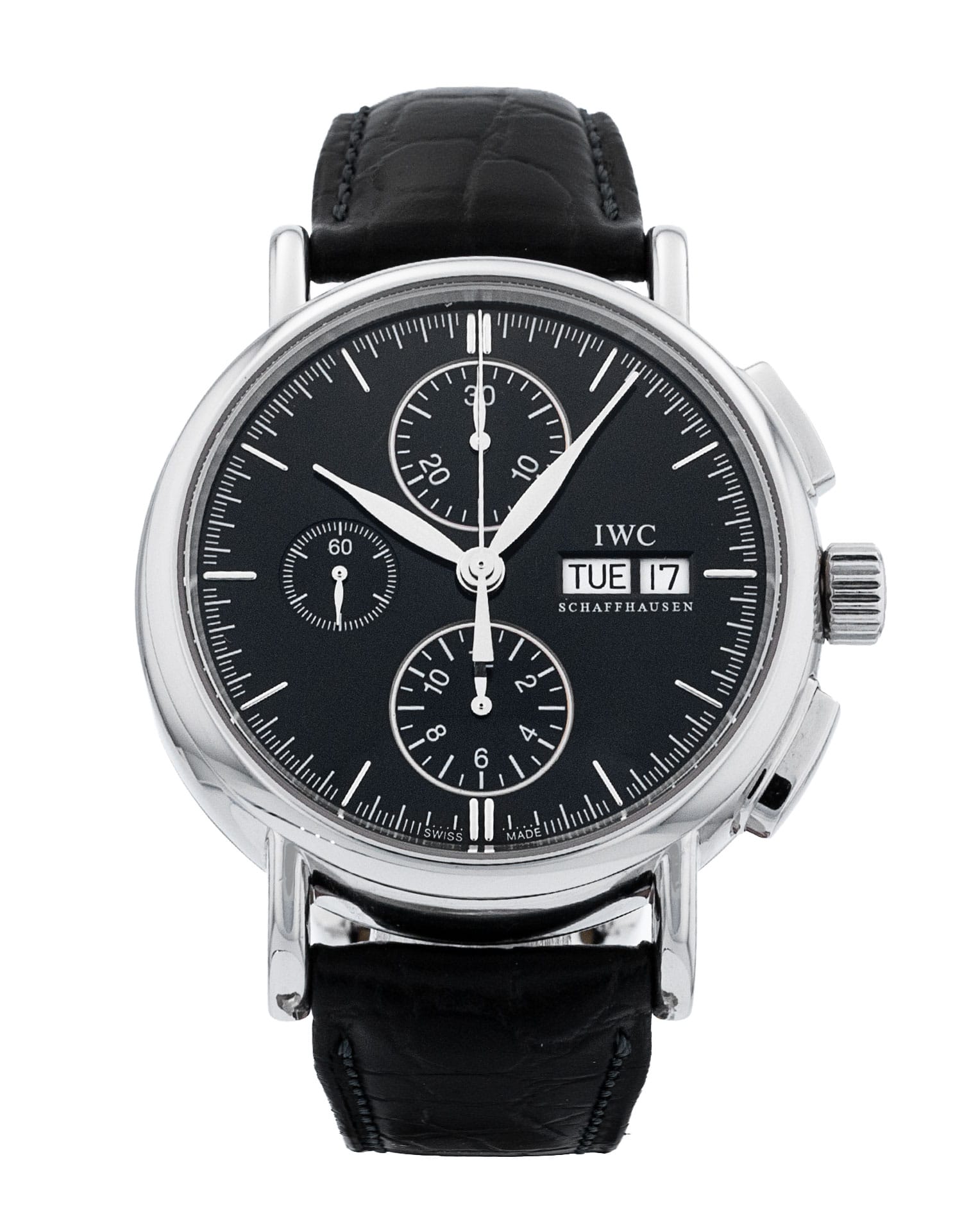 This IWC Portofino Chronograph IW378303 has a black baton dial and a leather strap. This IWC has undergone a thorough inspection of accuracy, functionality and condition at our IWC certified service centre to determine the level of reconditioning required to meet our strict standards. It has also been checked against our records to ensure authenticity. All our watches have a 24-month warranty for your peace of mind.