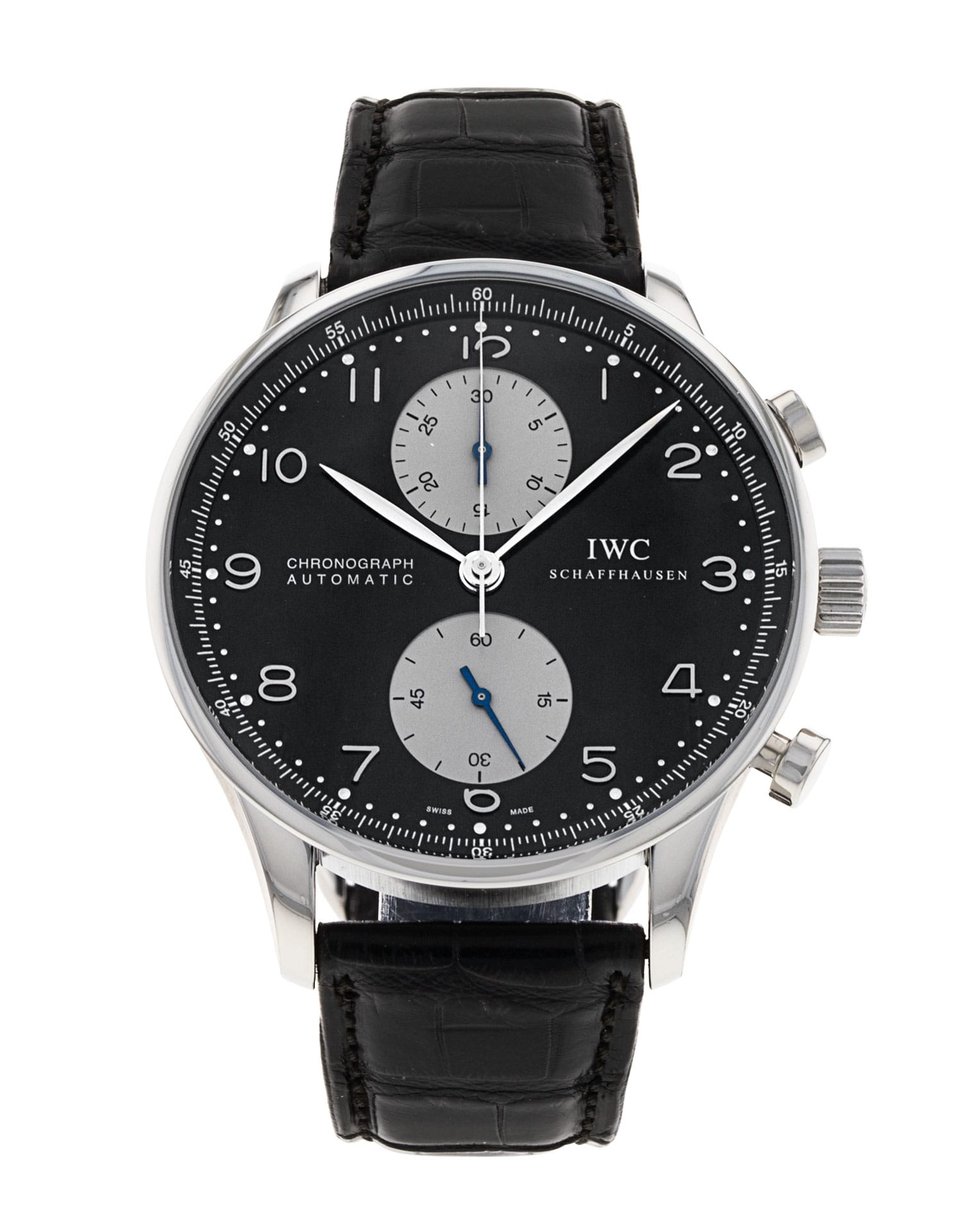 This IWC Portugieser Chrono IW371404 has a black arabic dial and a leather strap. This IWC has undergone a thorough inspection of accuracy, functionality and condition at our IWC certified service centre to determine the level of reconditioning required to meet our strict standards. It has also been checked against our records to ensure authenticity. All our watches have a 24-month warranty for your peace of mind.