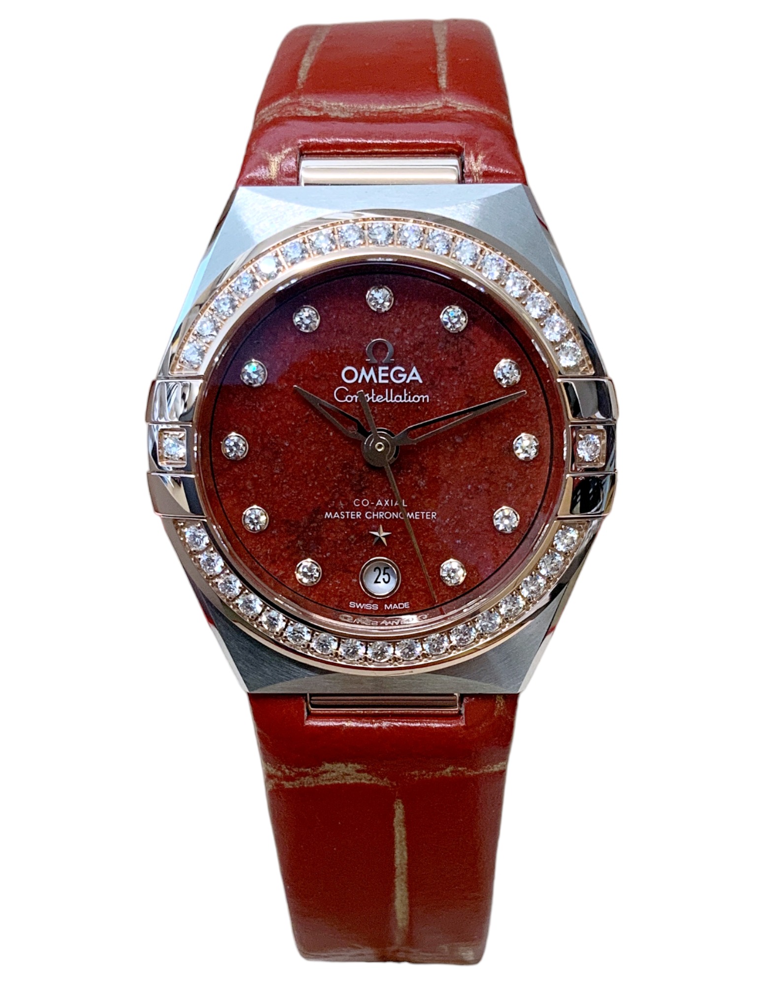 This Omega Constellation Ladies 131.28.29.20.99.002 has a red diamond dial and a leather strap. This Omega has undergone a thorough inspection of accuracy, functionality and condition at our Omega certified service centre to determine the level of reconditioning required to meet our strict standards. It has also been checked against our records to ensure authenticity. Our watches have a 24-month warranty for your peace of mind, in conjunction with any remaining manufacturer’s warranty from new or from service.