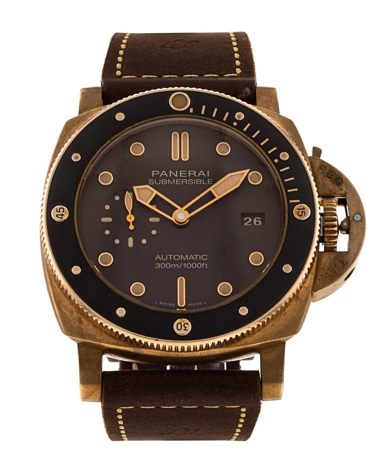 This Panerai Submersible PAM00968 has a brown dial and a leather strap. This Panerai has undergone a thorough inspection of accuracy, functionality and condition at our Panerai certified service centre to determine the level of reconditioning required to meet our strict standards. It has also been checked against our records to ensure authenticity. All our watches have a 24-month warranty for your peace of mind.