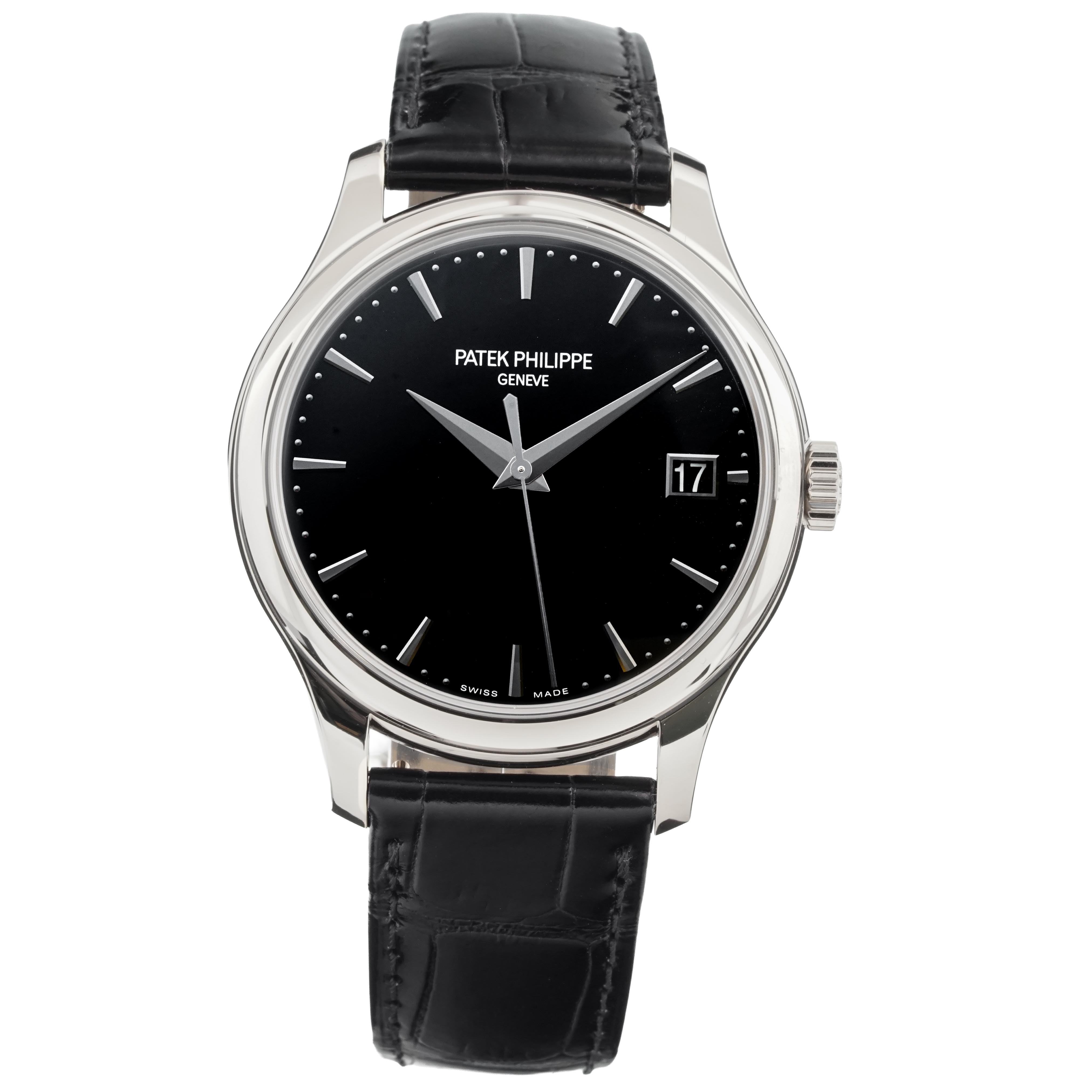 This Patek Philippe Calatrava 5227G-010 has a black baton dial and a leather strap. This Patek Philippe has undergone a thorough inspection of water resistance, accuracy, functionality and condition to determine the level of reconditioning required to meet our strict standards. It has also been referenced against technical documents and manufacturer records where available to ensure authenticity and a clean history. All our watches have a 24-month warranty for your peace of mind.