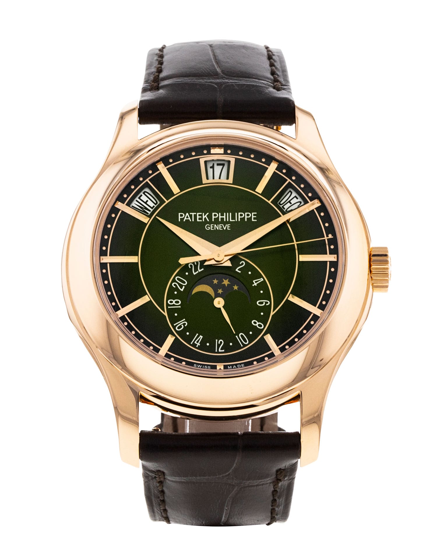 This Patek Philippe Complications 5205R-011 has a olive green baton dial and a leather strap. This Patek Philippe has undergone a thorough inspection of water resistance, accuracy, functionality and condition to determine the level of reconditioning required to meet our strict standards. It has also been referenced against technical documents and manufacturer records where available to ensure authenticity and a clean history. All our watches have a 24-month warranty for your peace of mind.