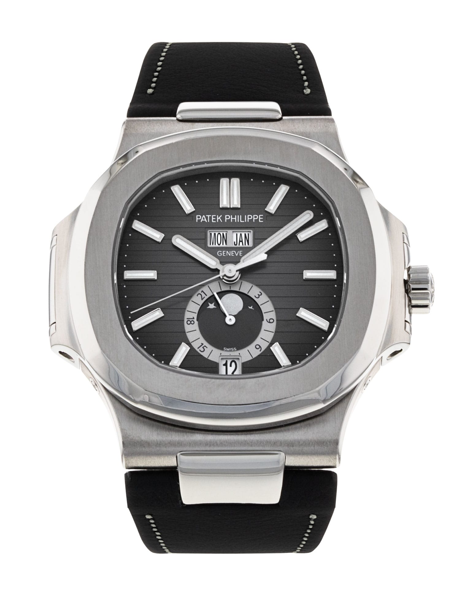 This Patek Philippe Nautilus 5726A-001 has a black dial and a leather strap. This Patek Philippe has undergone a thorough inspection of water resistance, accuracy, functionality and condition to determine the level of reconditioning required to meet our strict standards. It has also been referenced against technical documents and manufacturer records where available to ensure authenticity and a clean history. Our watches have a 24-month warranty for your peace of mind, in conjunction with any remaining manufacturer’s warranty from new or from service.
