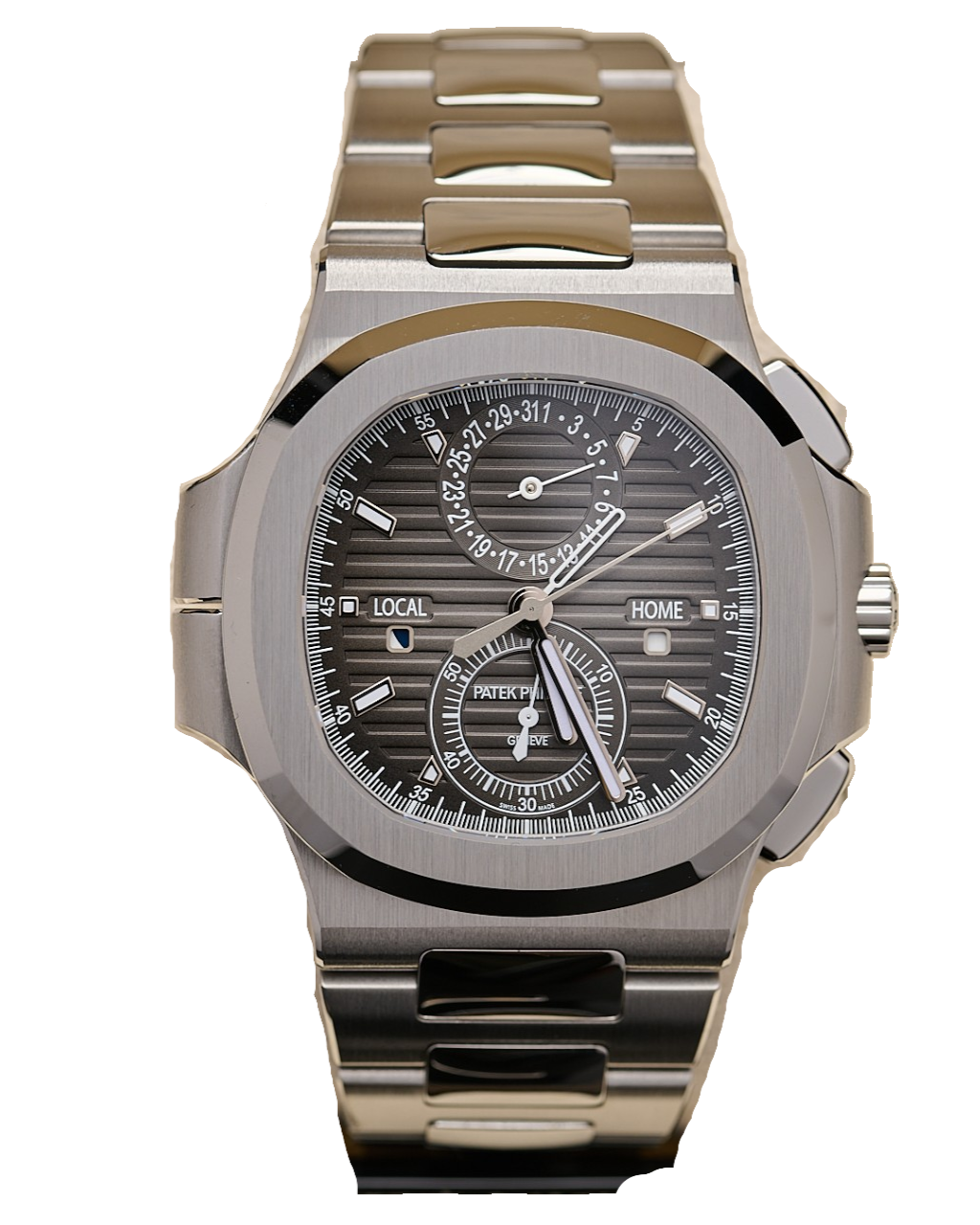 The brainchild of legendary watch designer Gerald Genta, the Nautilus was introduced in 1976 to compete with Audemars Piguet’s Royal Oak, another now-iconic Genta-designed steel sports watch launched a few years earlier. Its case shape, with ear-like projections either side, was like nothing the industry had seen before and despite not being an immediate hit it’s now one of the most sought-after Patek models around. The 5990/1A, now discontinued, enhances an already remarkable watch with a host of extremely useful functions, comprising a second time zone—with a day and night indicator for both local and home zones—a date, displayed on the sub dial between 11 and 1 o’clock, subsidiary seconds and a flyback chronograph. Stainless steel, with a horizontally embossed black dial and white gold applied hour markers, it exudes high-end luxury and is powered by the automatic Caliber 28-520 S C FUS which holds a power reserve of 45 hours. The movement is visible through the case back, revealing the 21k gold rotor engraved with the brand’s Calatrava cross and decorated with côte de Genève stripes.