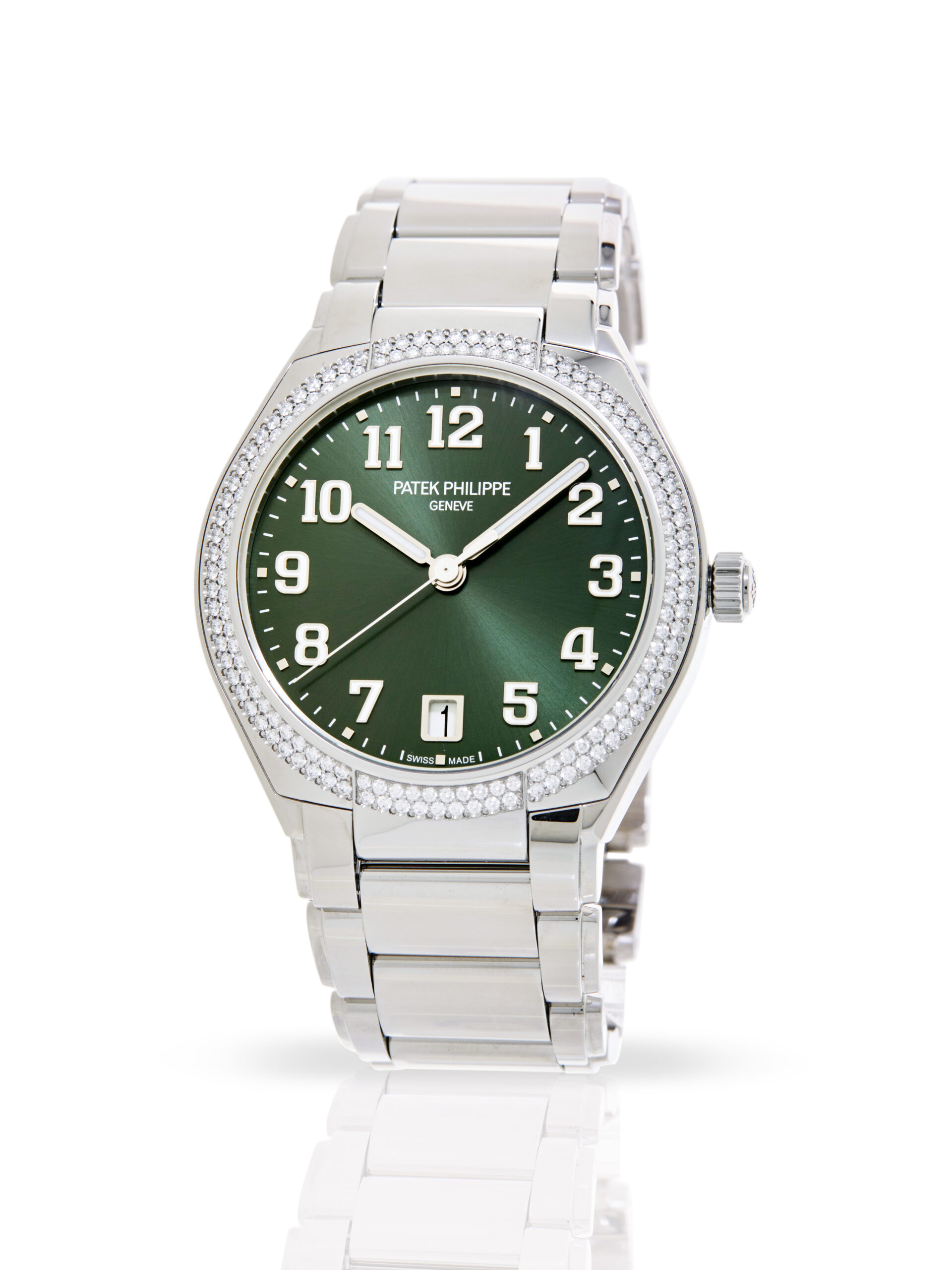This Patek Philippe Twenty-4 7300/1200A-011 has a green arabic dial and a bracelet strap. This Patek Philippe has undergone a thorough inspection of water resistance, accuracy, functionality and condition to determine the level of reconditioning required to meet our strict standards. It has also been referenced against technical documents and manufacturer records where available to ensure authenticity and a clean history. All our watches have a 24-month warranty for your peace of mind.