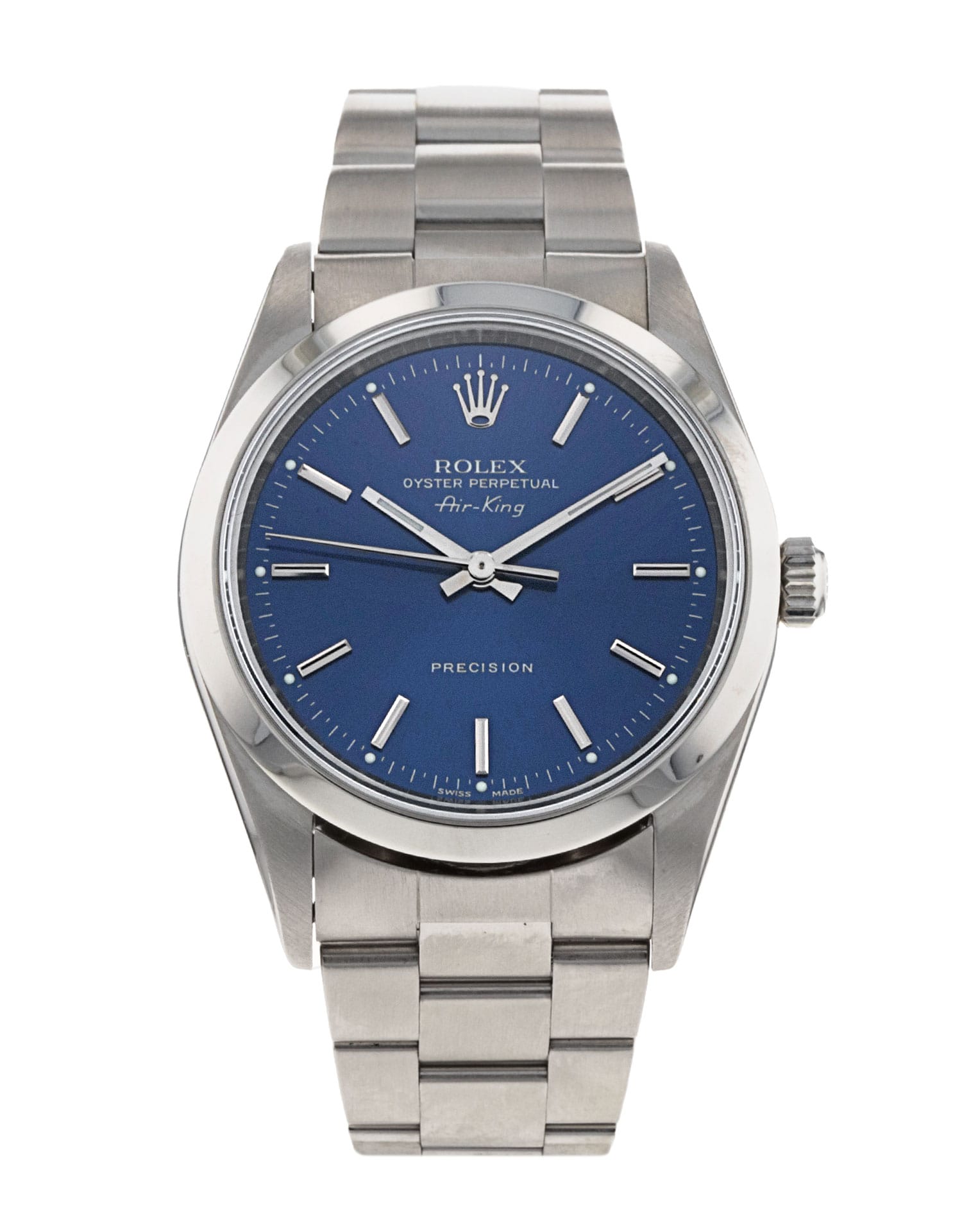 This Rolex Air-King 14000 has a blue baton dial and a bracelet strap. This Rolex has undergone a thorough inspection of water resistance, accuracy, functionality and condition to determine the level of reconditioning required to meet our strict standards. It has also been referenced against technical documents and manufacturer records where available to ensure authenticity and a clean history. All our watches have a 24-month warranty for your peace of mind. One of our skilled polishing technicians has removed marks on the case and bracelet of this watch, brought about by daily wear and tear, which is why this watch does not come with the remaining manufacturer’s warranty.