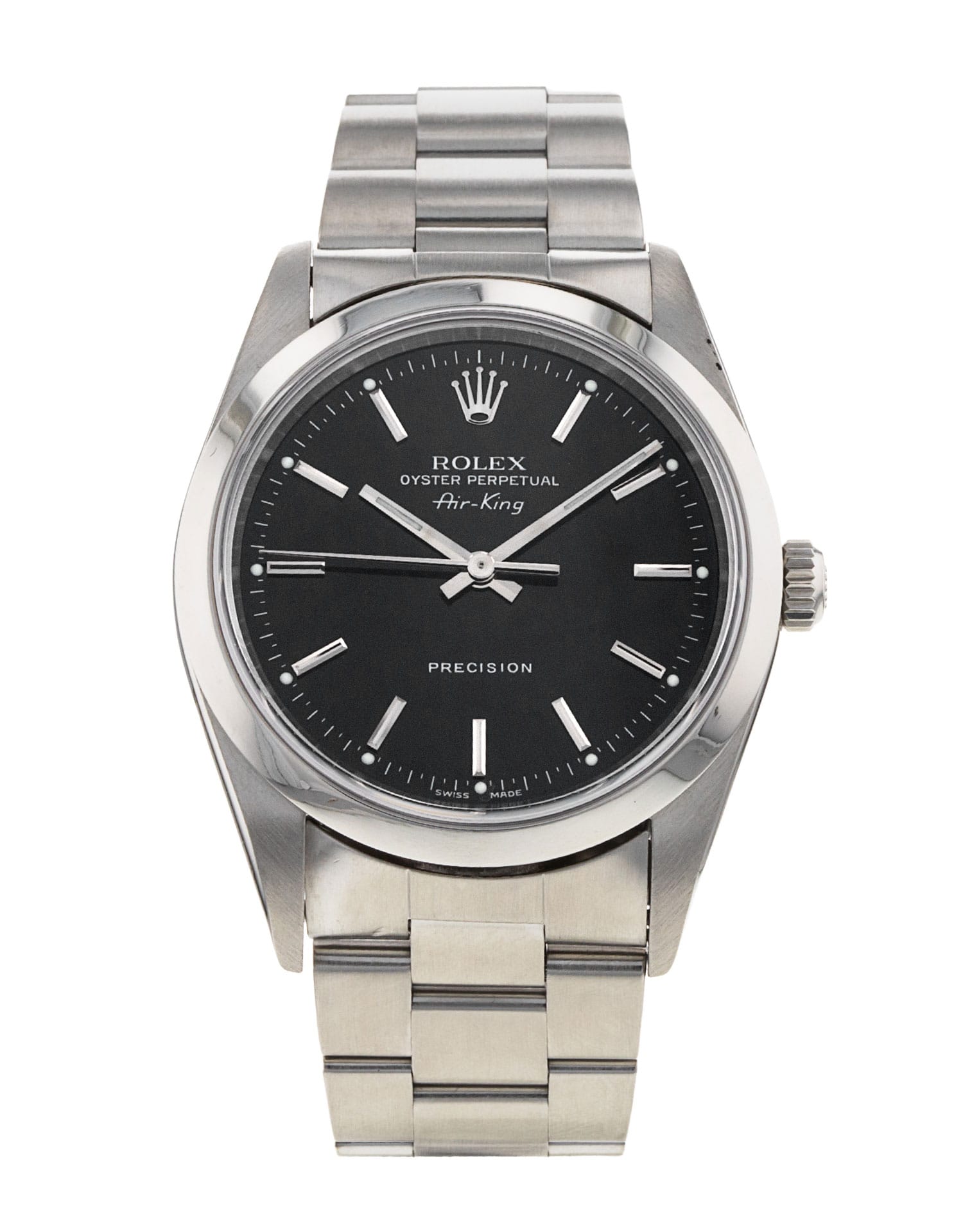 This Rolex Air-King 14000M has a black baton dial and a bracelet strap. This Rolex has undergone a thorough inspection of water resistance, accuracy, functionality and condition to determine the level of reconditioning required to meet our strict standards. It has also been referenced against technical documents and manufacturer records where available to ensure authenticity and a clean history. All our watches have a 24-month warranty for your peace of mind. One of our skilled polishing technicians has removed marks on the case and bracelet of this watch, brought about by daily wear and tear, which is why this watch does not come with the remaining manufacturer’s warranty.
