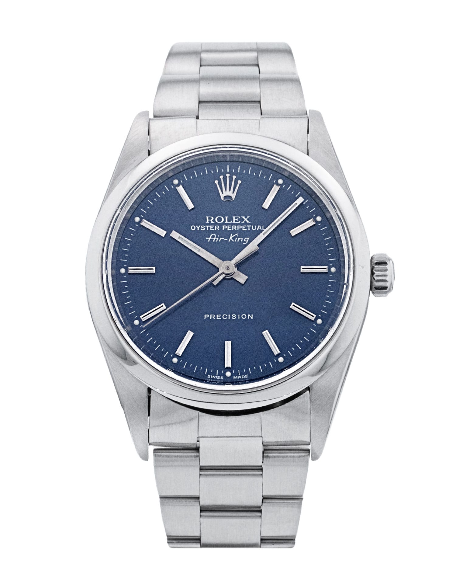 This Rolex Air-King 14010 has a blue baton dial and a bracelet strap. This Rolex has undergone a thorough inspection of water resistance, accuracy, functionality and condition to determine the level of reconditioning required to meet our strict standards. It has also been referenced against technical documents and manufacturer records where available to ensure authenticity and a clean history. All our watches have a 24-month warranty for your peace of mind. One of our skilled polishing technicians has removed marks on the case and bracelet of this watch, brought about by daily wear and tear, which is why this watch does not come with the remaining manufacturer’s warranty.
