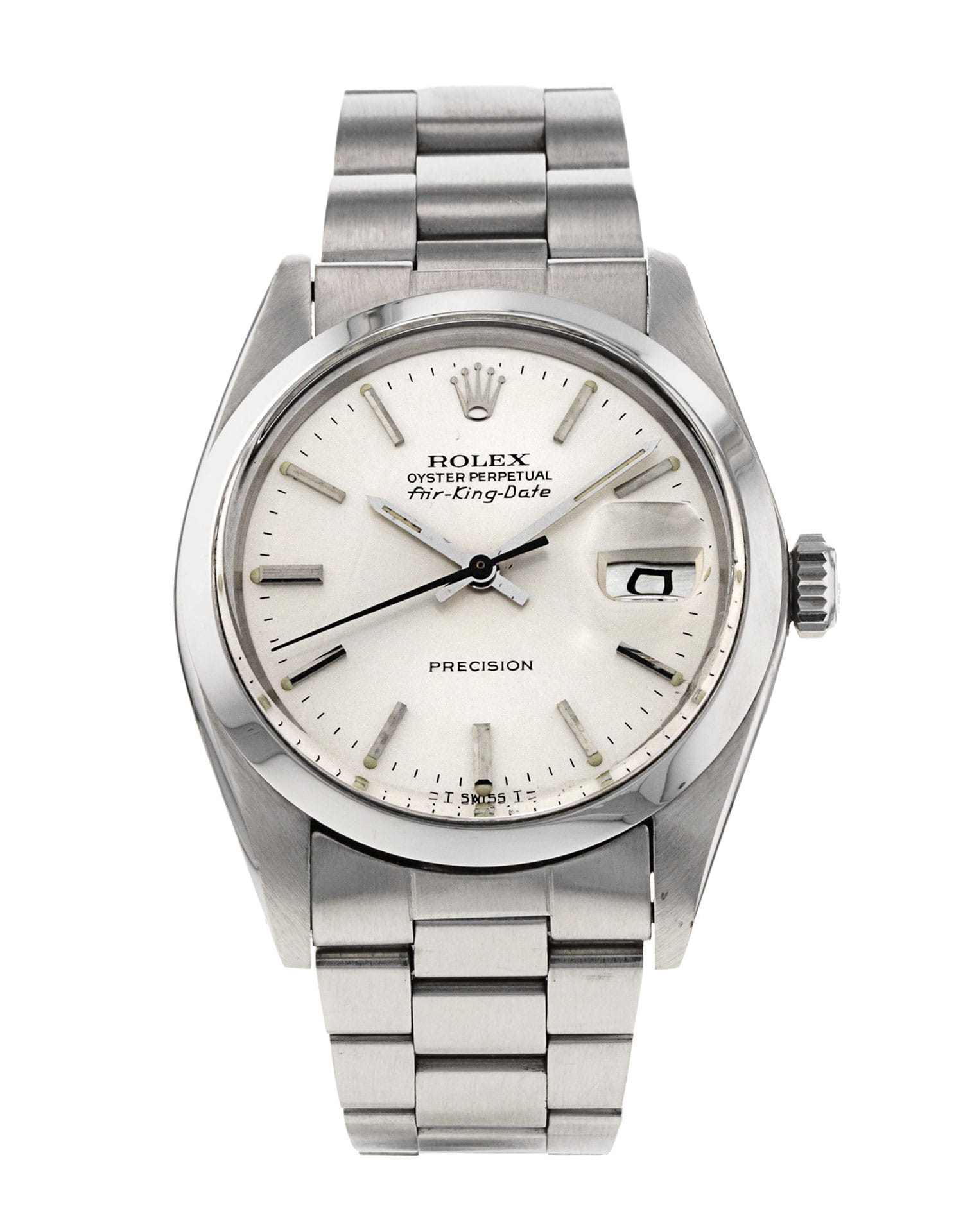 This Rolex Air-King 5700 has a silver baton dial and a bracelet strap. Due to age, this Rolex may not fall within our typical expected tolerances for timekeeping, and is no longer suitable for use in wet environments or submersion in water. In the interests of preserving original features, utmost care has been taken to sympathetically restore this watch. It has also been referenced against technical documents and manufacturer records where available to ensure authenticity and a clean history. One of our skilled polishing technicians has removed marks on the case and bracelet of this watch, brought about by daily wear and tear, which is why this watch does not come with the remaining manufacturer’s warranty.