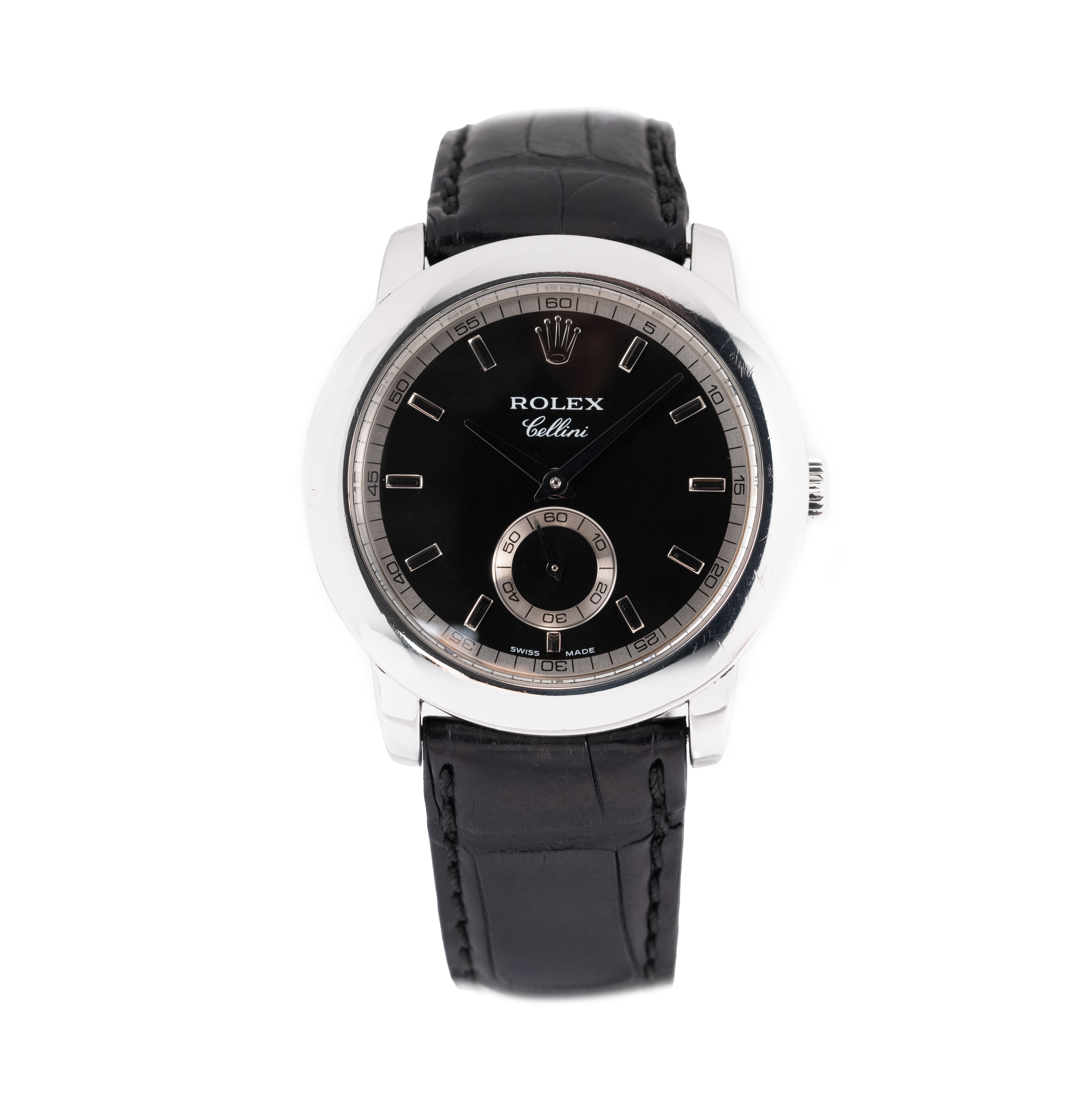This Rolex Cellini 5241/6 has a black baton dial and a leather strap. This Rolex has undergone a thorough inspection of accuracy, functionality and condition to determine the level of reconditioning required to meet our strict standards. It has also been referenced against technical documents and manufacturer records where available to ensure authenticity and a clean history. All our watches have a 24-month warranty for your peace of mind. One of our skilled polishing technicians has removed marks on the case and bracelet of this watch, brought about by daily wear and tear, which is why this watch does not come with the remaining manufacturer’s warranty.