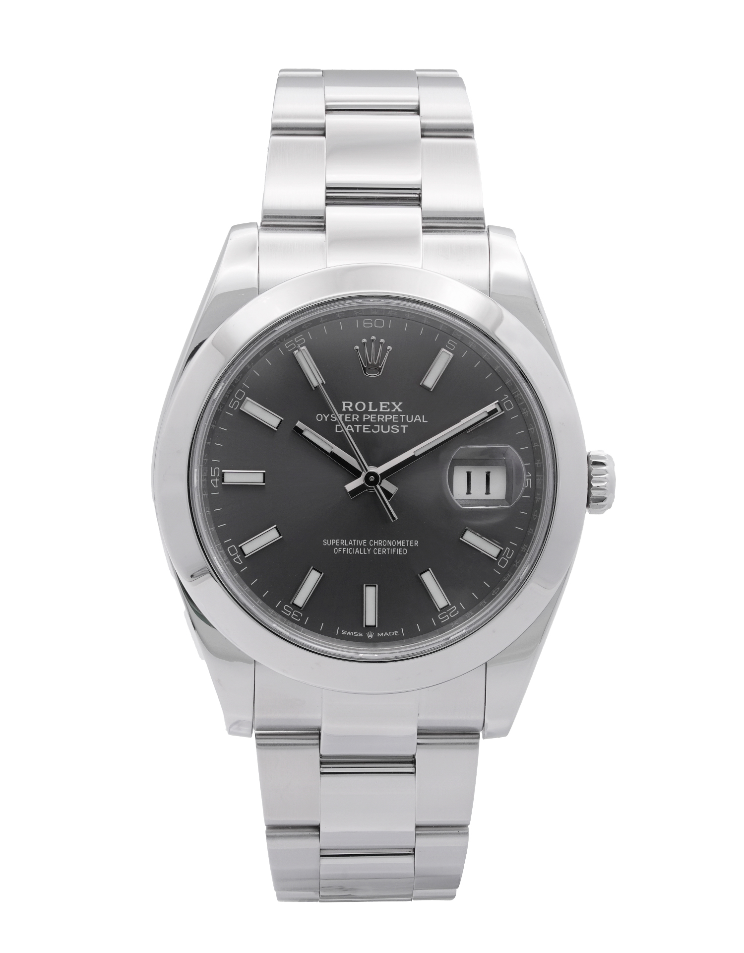 This Rolex Datejust 41 126300 has a slate baton dial and a bracelet strap. This Rolex has undergone a thorough inspection of water resistance, accuracy, functionality and condition to determine the level of reconditioning required to meet our strict standards. It has also been referenced against technical documents and manufacturer records where available to ensure authenticity and a clean history. Our watches have a 24-month warranty for your peace of mind, in conjunction with any remaining manufacturer’s warranty from new or from service. To maintain the manufacturer’s warranty on this watch, it has not been polished in our service centre.