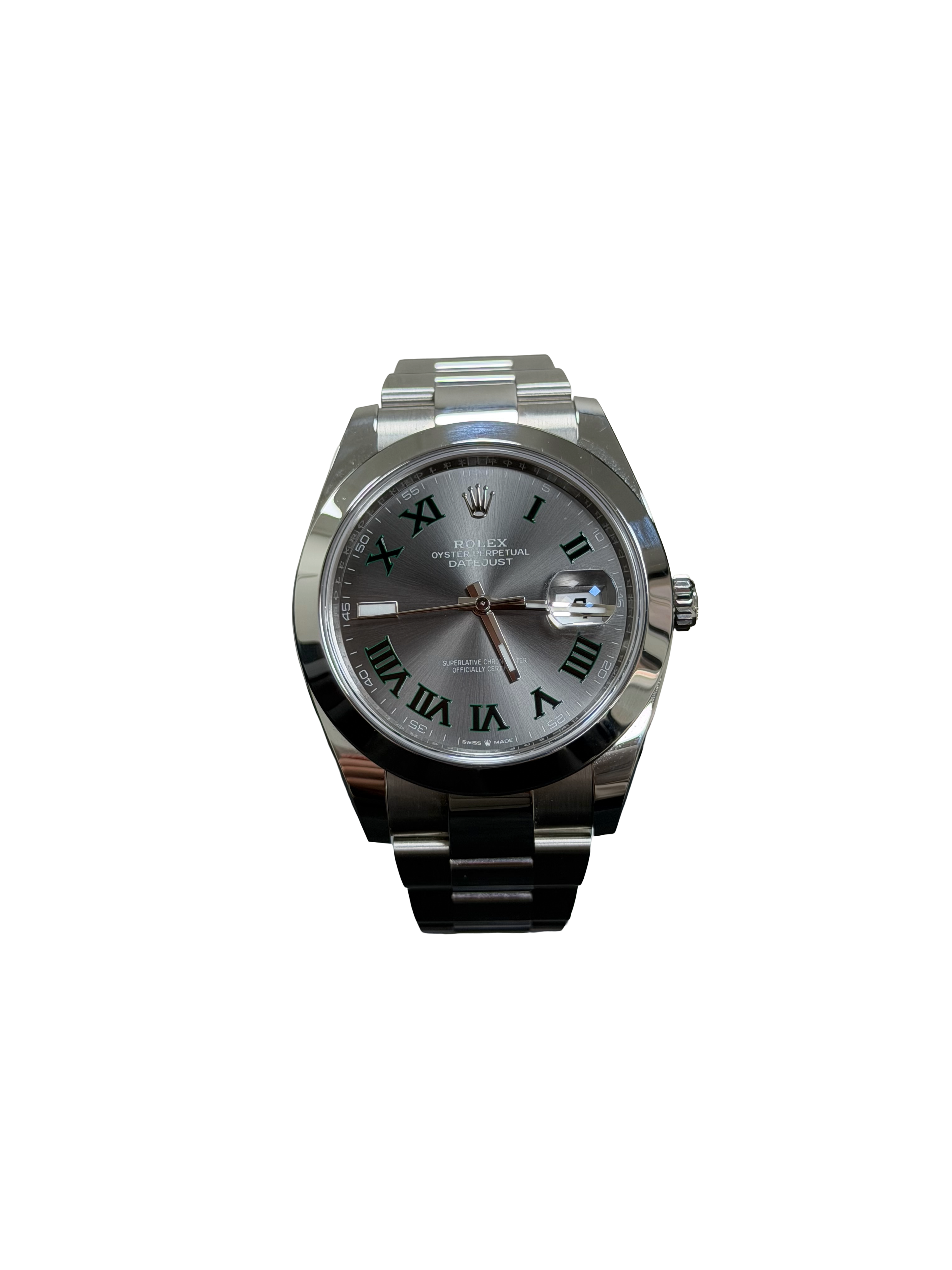 This Rolex Datejust 41 126300 has a slate roman numeral dial and a bracelet strap. This Rolex has undergone a thorough inspection of water resistance, accuracy, functionality and condition to determine the level of reconditioning required to meet our strict standards. It has also been referenced against technical documents and manufacturer records where available to ensure authenticity and a clean history. All our watches have a 24-month warranty for your peace of mind. One of our skilled polishing technicians has removed marks on the case and bracelet of this watch, brought about by daily wear and tear, which is why this watch does not come with the remaining manufacturer’s warranty.