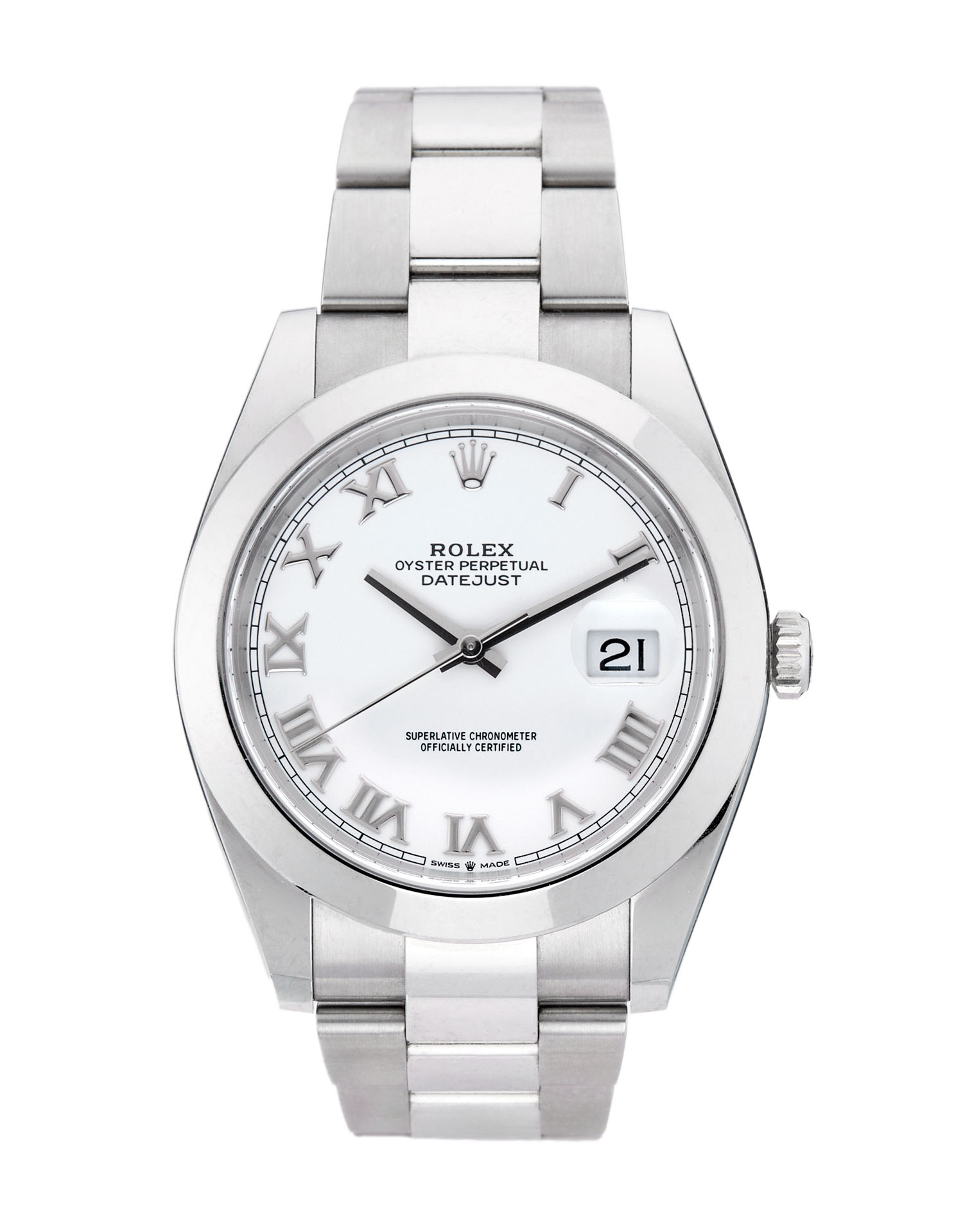 This Rolex Datejust 41 126300 has a white roman numeral dial and a bracelet strap. This Rolex has undergone a thorough inspection of water resistance, accuracy, functionality and condition to determine the level of reconditioning required to meet our strict standards. It has also been referenced against technical documents and manufacturer records where available to ensure authenticity and a clean history. All our watches have a 24-month warranty for your peace of mind. One of our skilled polishing technicians has removed marks on the case and bracelet of this watch, brought about by daily wear and tear, which is why this watch does not come with the remaining manufacturer’s warranty.
