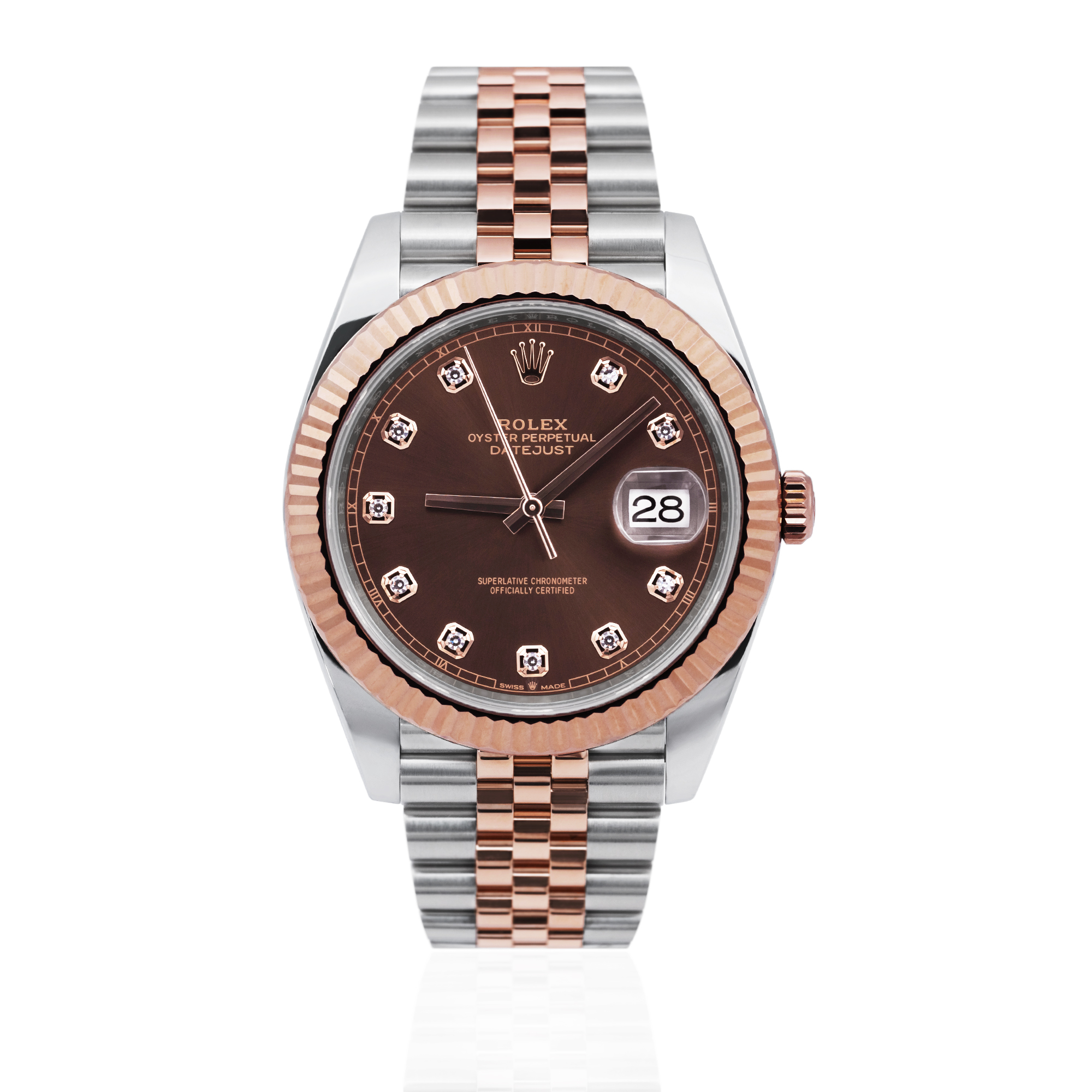 This Rolex Datejust 41 126331 has a chocolate diamond dial and a bracelet strap. This Rolex has undergone a thorough inspection of water resistance, accuracy, functionality and condition to determine the level of reconditioning required to meet our strict standards. It has also been referenced against technical documents and manufacturer records where available to ensure authenticity and a clean history. All our watches have a 24-month warranty for your peace of mind. One of our skilled polishing technicians has removed marks on the case and bracelet of this watch, brought about by daily wear and tear, which is why this watch does not come with the remaining manufacturer’s warranty.
