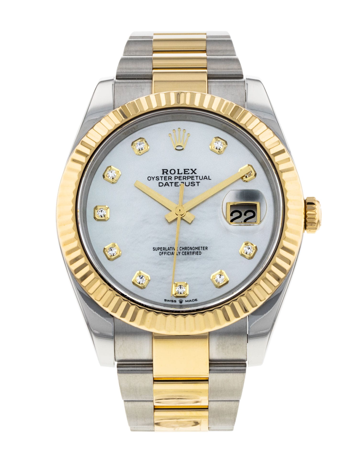 This Rolex Datejust 41 126333 has a mother of pearl white - diamond dial and a bracelet strap. This Rolex has undergone a thorough inspection of water resistance, accuracy, functionality and condition to determine the level of reconditioning required to meet our strict standards. It has also been referenced against technical documents and manufacturer records where available to ensure authenticity and a clean history. All our watches have a 24-month warranty for your peace of mind. One of our skilled polishing technicians has removed marks on the case and bracelet of this watch, brought about by daily wear and tear, which is why this watch does not come with the remaining manufacturer’s warranty.