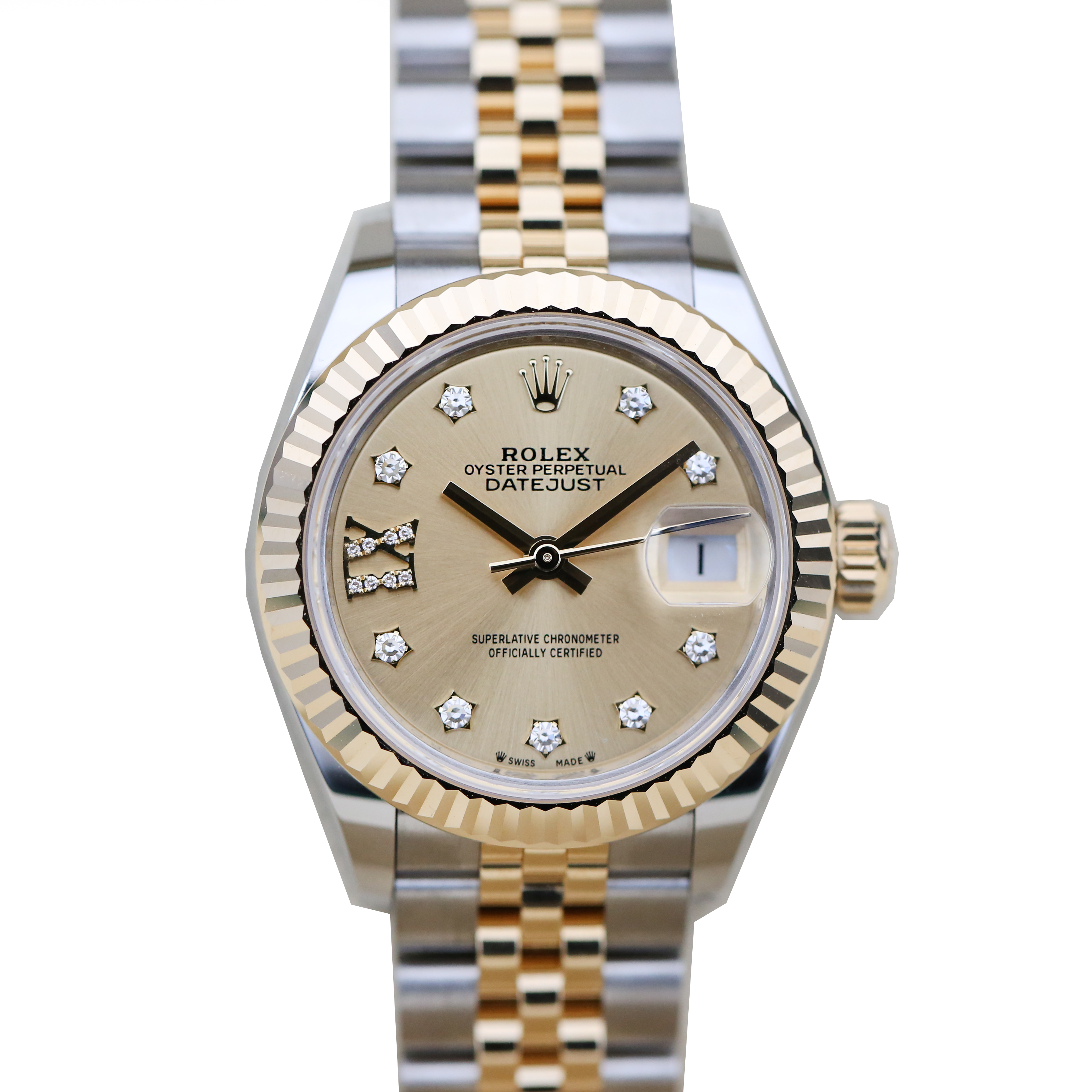 This Rolex Datejust Lady 28 279173 has a champagne roman numeral diamond dial and a bracelet strap. This Rolex has undergone a thorough inspection of water resistance, accuracy, functionality and condition to determine the level of reconditioning required to meet our strict standards. It has also been referenced against technical documents and manufacturer records where available to ensure authenticity and a clean history. Our watches have a 24-month warranty for your peace of mind, in conjunction with any remaining manufacturer’s warranty from new or from service. To maintain the manufacturer’s warranty on this watch, it has not been polished in our service centre.