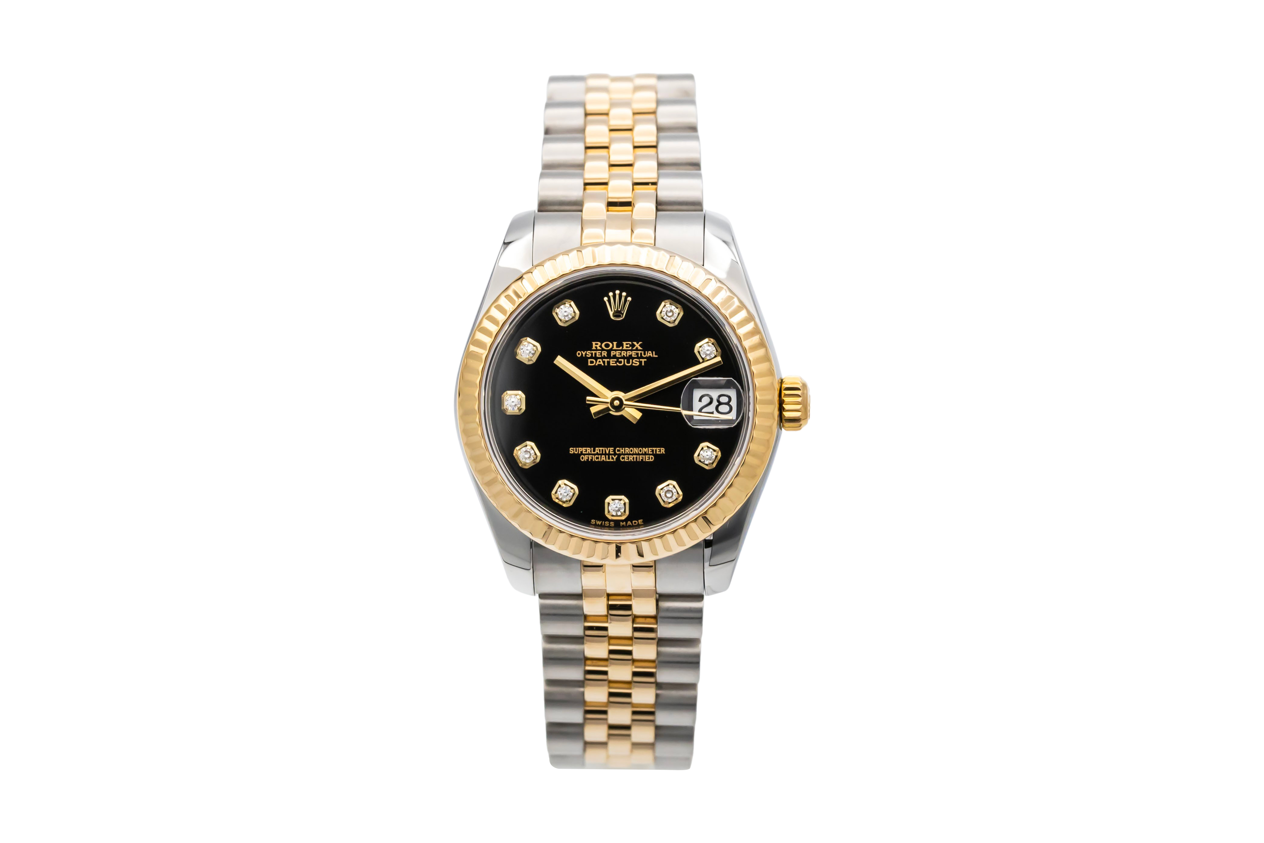 This Rolex Datejust Lady 31 178273 has a black diamond dial and a bracelet strap. This Rolex has undergone a thorough inspection of water resistance, accuracy, functionality and condition to determine the level of reconditioning required to meet our strict standards. It has also been referenced against technical documents and manufacturer records where available to ensure authenticity and a clean history. All our watches have a 24-month warranty for your peace of mind. One of our skilled polishing technicians has removed marks on the case and bracelet of this watch, brought about by daily wear and tear, which is why this watch does not come with the remaining manufacturer’s warranty.
