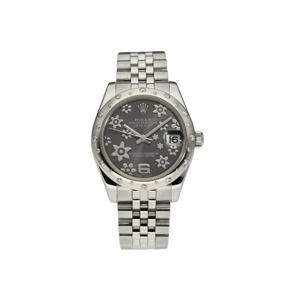 This Rolex Datejust Lady 31 178344 has a rhodium flower dial and a bracelet strap. This Rolex has undergone a thorough inspection of water resistance, accuracy, functionality and condition to determine the level of reconditioning required to meet our strict standards. It has also been referenced against technical documents and manufacturer records where available to ensure authenticity and a clean history. All our watches have a 24-month warranty for your peace of mind. One of our skilled polishing technicians has removed marks on the case and bracelet of this watch, brought about by daily wear and tear, which is why this watch does not come with the remaining manufacturer’s warranty.