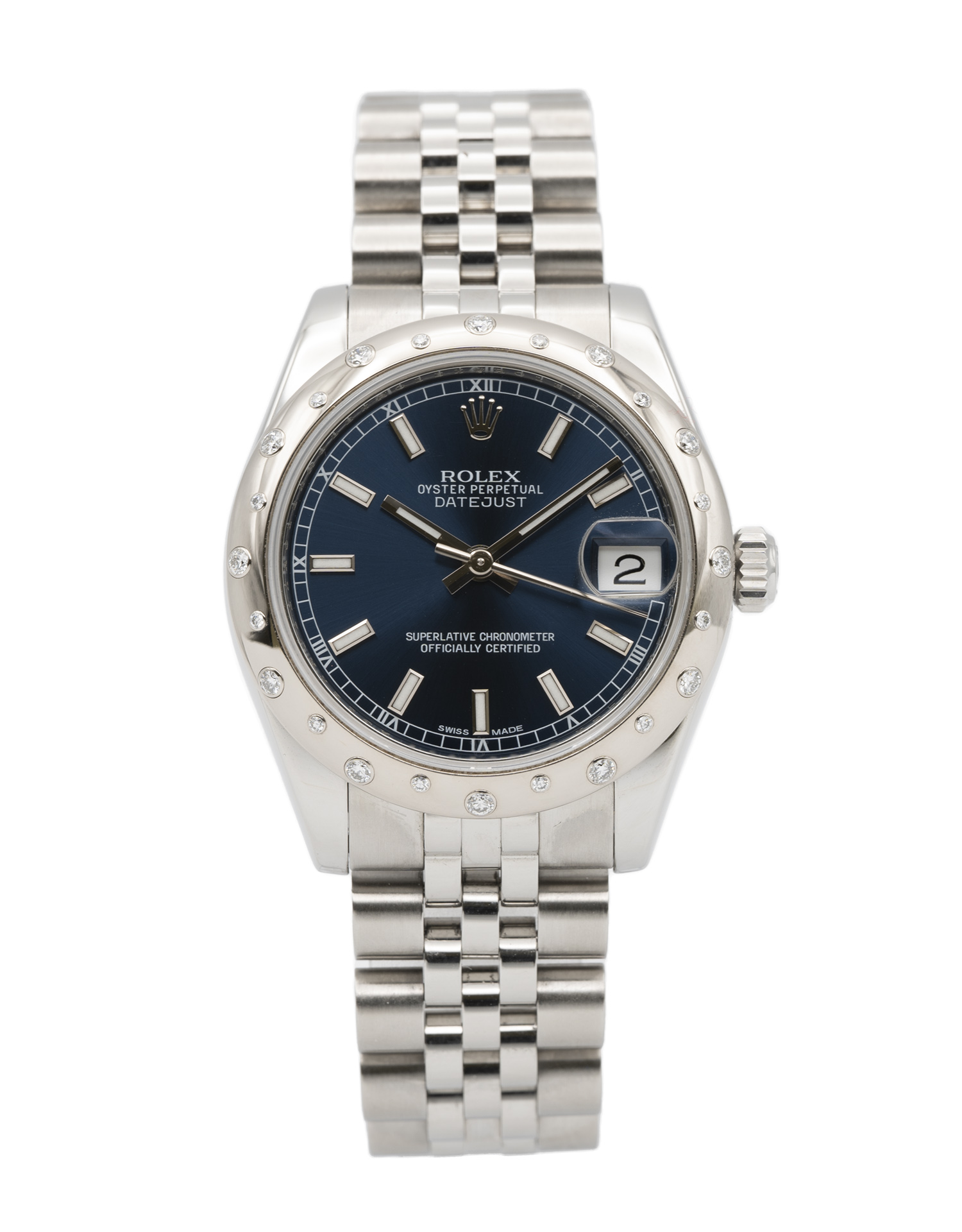 This Rolex Datejust Lady 31 178344 has a blue roman numeral dial and a bracelet strap. This Rolex has undergone a thorough inspection of water resistance, accuracy, functionality and condition to determine the level of reconditioning required to meet our strict standards. It has also been referenced against technical documents and manufacturer records where available to ensure authenticity and a clean history. All our watches have a 24-month warranty for your peace of mind. One of our skilled polishing technicians has removed marks on the case and bracelet of this watch, brought about by daily wear and tear, which is why this watch does not come with the remaining manufacturer’s warranty.