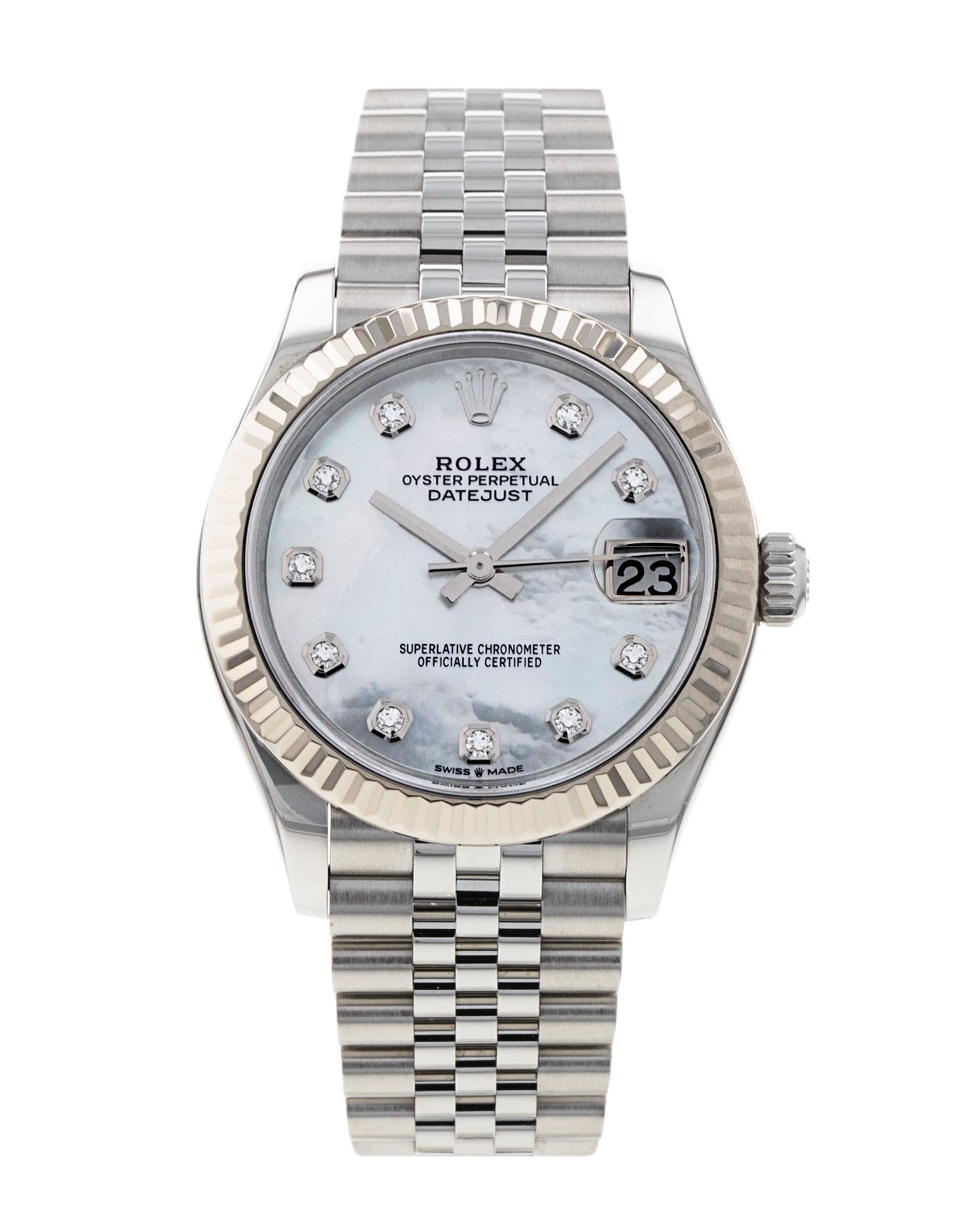 This Rolex Datejust Lady 31 278274 has a mother of pearl white - diamond dial and a bracelet strap. This Rolex has undergone a thorough inspection of water resistance, accuracy, functionality and condition to determine the level of reconditioning required to meet our strict standards. It has also been referenced against technical documents and manufacturer records where available to ensure authenticity and a clean history. All our watches have a 24-month warranty for your peace of mind. One of our skilled polishing technicians has removed marks on the case and bracelet of this watch, brought about by daily wear and tear, which is why this watch does not come with the remaining manufacturer’s warranty.