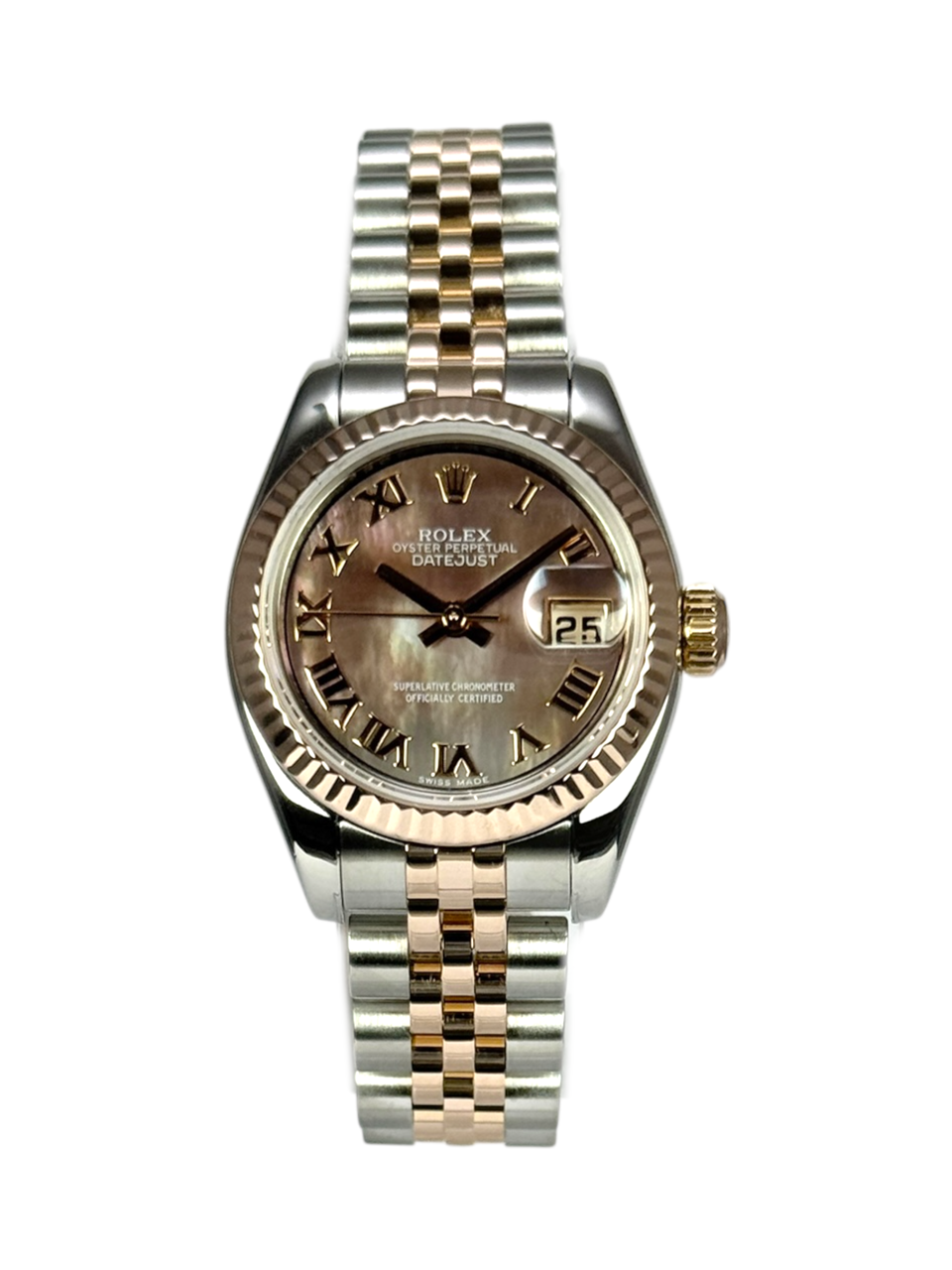 This Rolex Datejust Lady 179171 has a mother of pearl - black roman numeral dial and a bracelet strap. This Rolex has undergone a thorough inspection of water resistance, accuracy, functionality and condition to determine the level of reconditioning required to meet our strict standards. It has also been referenced against technical documents and manufacturer records where available to ensure authenticity and a clean history. All our watches have a 24-month warranty for your peace of mind. One of our skilled polishing technicians has removed marks on the case and bracelet of this watch, brought about by daily wear and tear, which is why this watch does not come with the remaining manufacturer’s warranty.