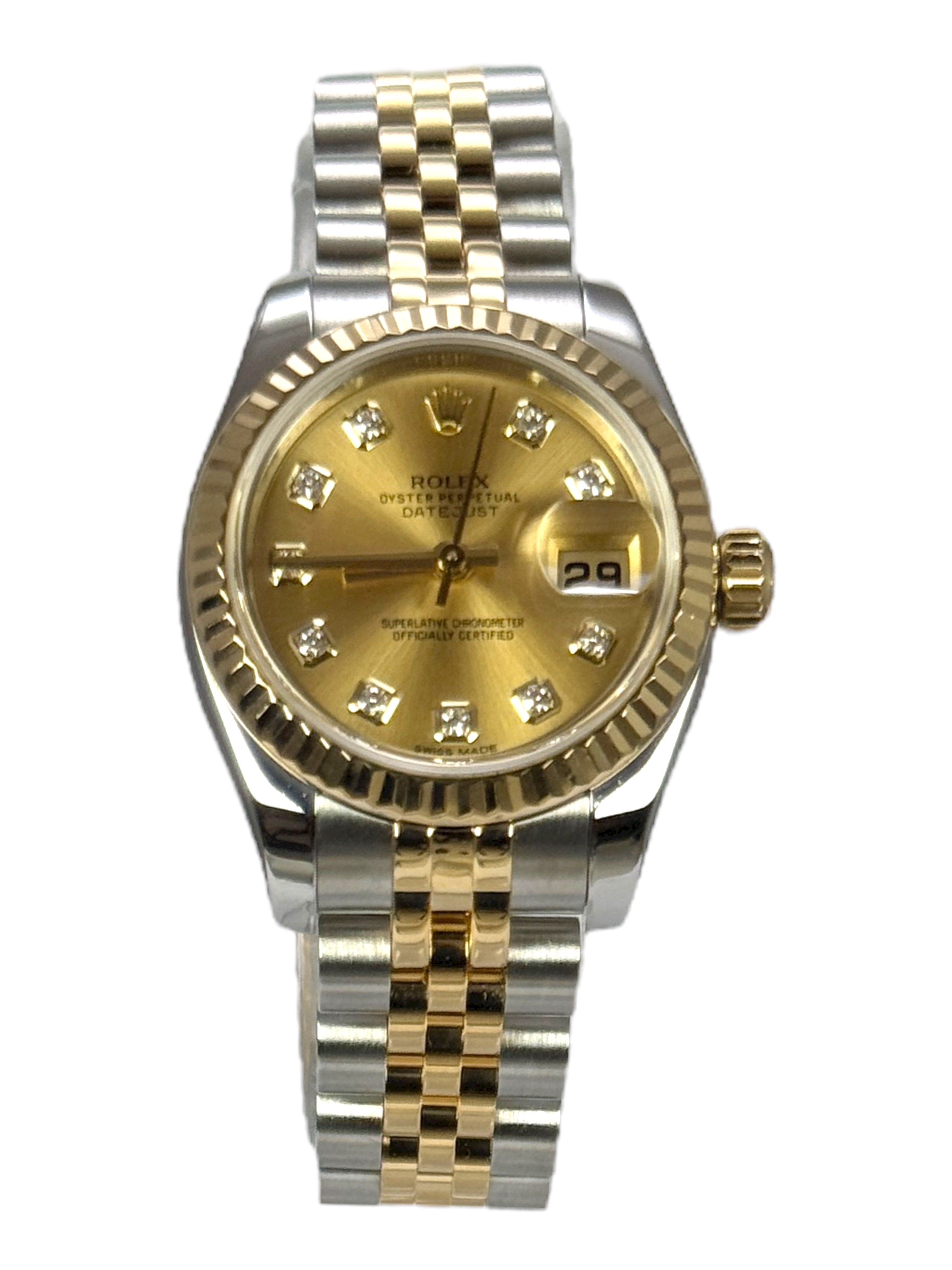 This Rolex Datejust Lady 179173 has a champagne diamond dial and a bracelet strap. This Rolex has undergone a thorough inspection of water resistance, accuracy, functionality and condition to determine the level of reconditioning required to meet our strict standards. It has also been referenced against technical documents and manufacturer records where available to ensure authenticity and a clean history. All our watches have a 24-month warranty for your peace of mind. One of our skilled polishing technicians has removed marks on the case and bracelet of this watch, brought about by daily wear and tear, which is why this watch does not come with the remaining manufacturer’s warranty.