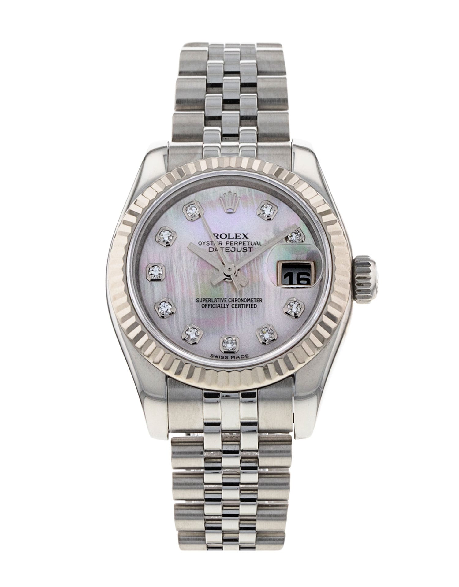 This Rolex Datejust Lady 179174 has a mother of pearl white - diamond dial and a bracelet strap. This Rolex has undergone a thorough inspection of water resistance, accuracy, functionality and condition to determine the level of reconditioning required to meet our strict standards. It has also been referenced against technical documents and manufacturer records where available to ensure authenticity and a clean history. All our watches have a 24-month warranty for your peace of mind. One of our skilled polishing technicians has removed marks on the case and bracelet of this watch, brought about by daily wear and tear, which is why this watch does not come with the remaining manufacturer’s warranty.