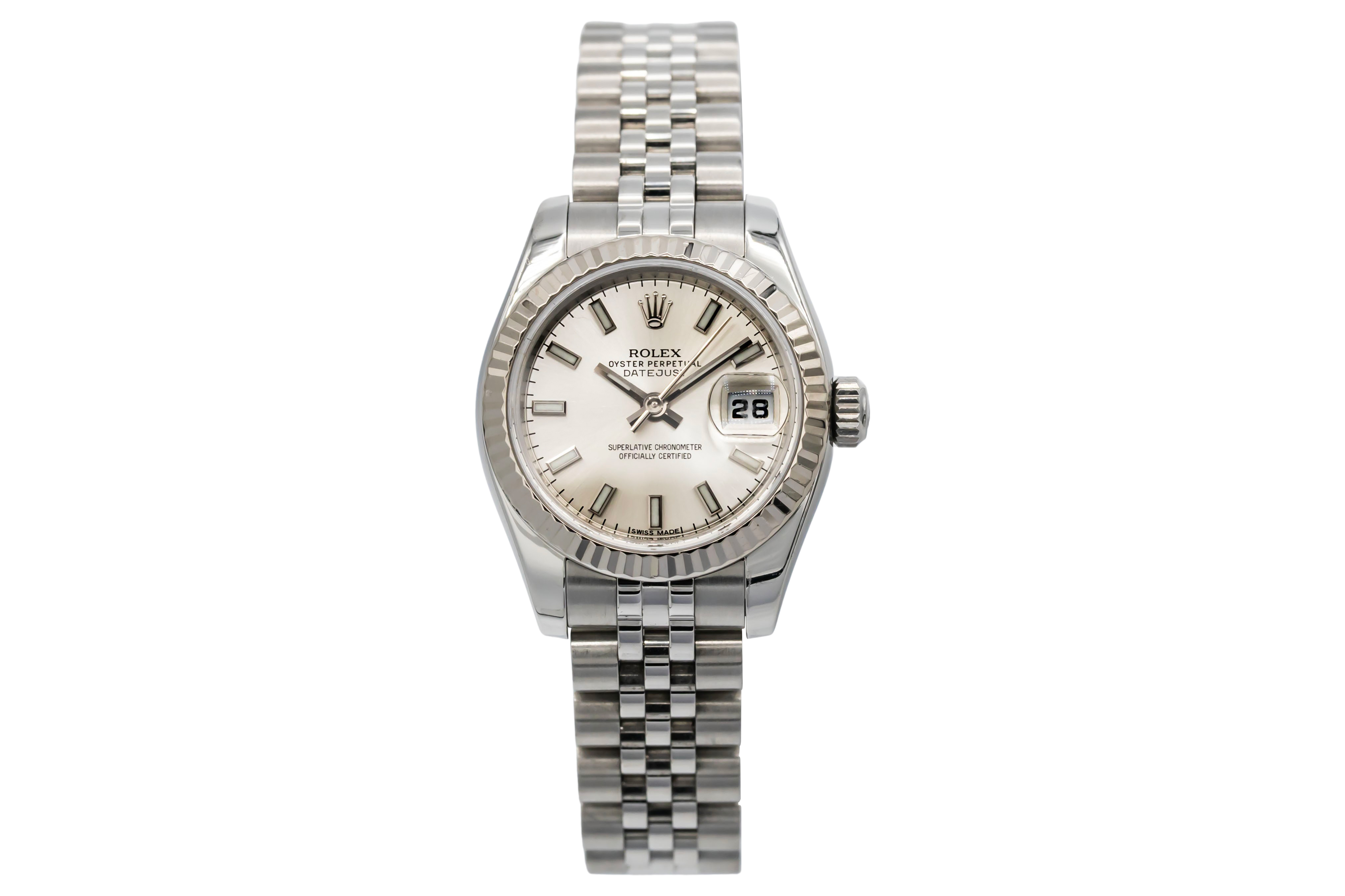 This Rolex Datejust Lady 179174 has a silver baton dial and a bracelet strap. This Rolex has undergone a thorough inspection of water resistance, accuracy, functionality and condition to determine the level of reconditioning required to meet our strict standards. It has also been referenced against technical documents and manufacturer records where available to ensure authenticity and a clean history. All our watches have a 24-month warranty for your peace of mind. One of our skilled polishing technicians has removed marks on the case and bracelet of this watch, brought about by daily wear and tear, which is why this watch does not come with the remaining manufacturer’s warranty.