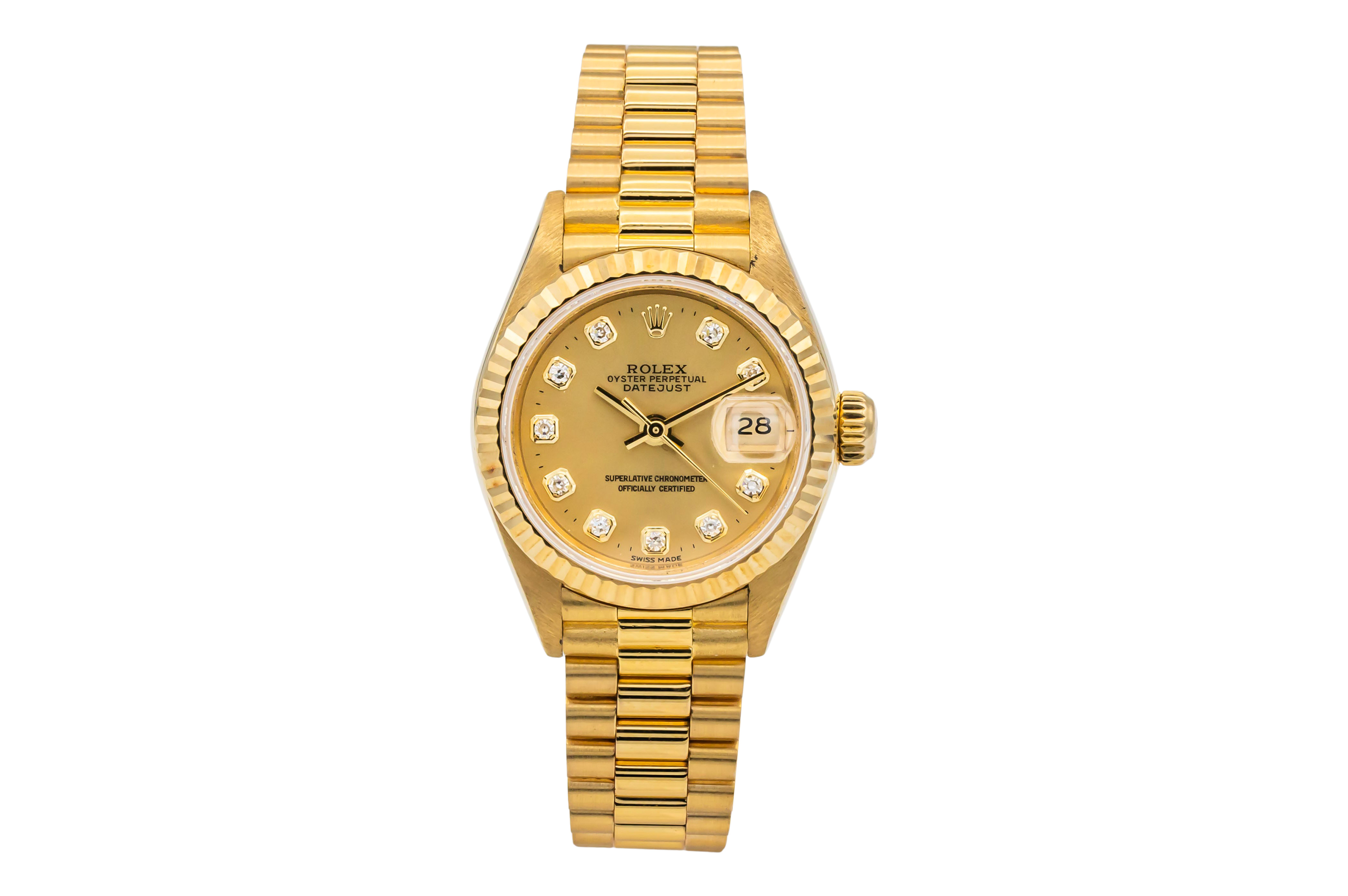This Rolex Datejust Lady 69178 has a champagne diamond dial and a bracelet strap. This Rolex has undergone a thorough inspection of water resistance, accuracy, functionality and condition to determine the level of reconditioning required to meet our strict standards. It has also been referenced against technical documents and manufacturer records where available to ensure authenticity and a clean history. All our watches have a 24-month warranty for your peace of mind. One of our skilled polishing technicians has removed marks on the case and bracelet of this watch, brought about by daily wear and tear, which is why this watch does not come with the remaining manufacturer’s warranty.
