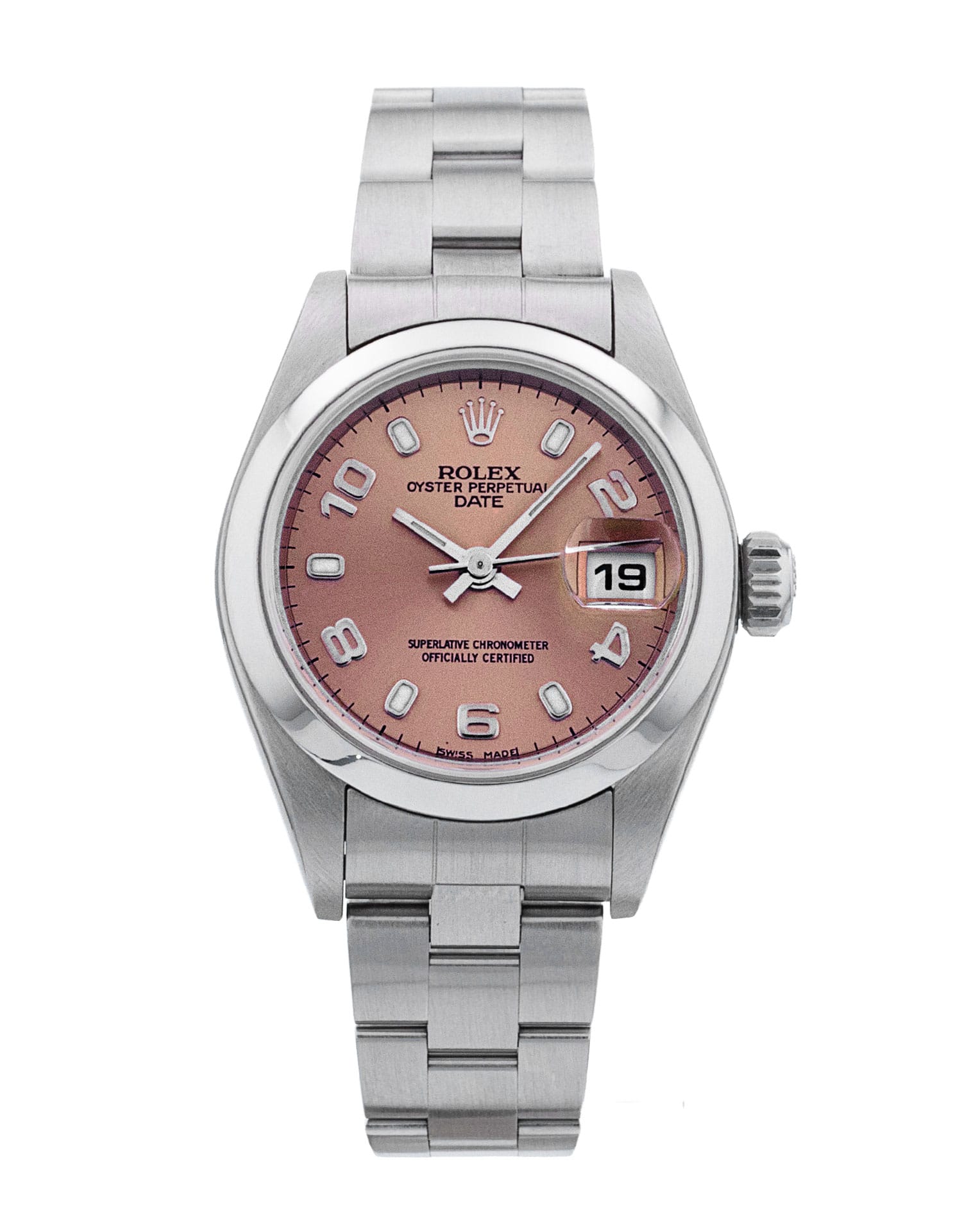 This Rolex Datejust Lady 79160 has a salmon arabic dial and a bracelet strap. This Rolex has undergone a thorough inspection of water resistance, accuracy, functionality and condition to determine the level of reconditioning required to meet our strict standards. It has also been referenced against technical documents and manufacturer records where available to ensure authenticity and a clean history. All our watches have a 24-month warranty for your peace of mind. One of our skilled polishing technicians has removed marks on the case and bracelet of this watch, brought about by daily wear and tear, which is why this watch does not come with the remaining manufacturer’s warranty.