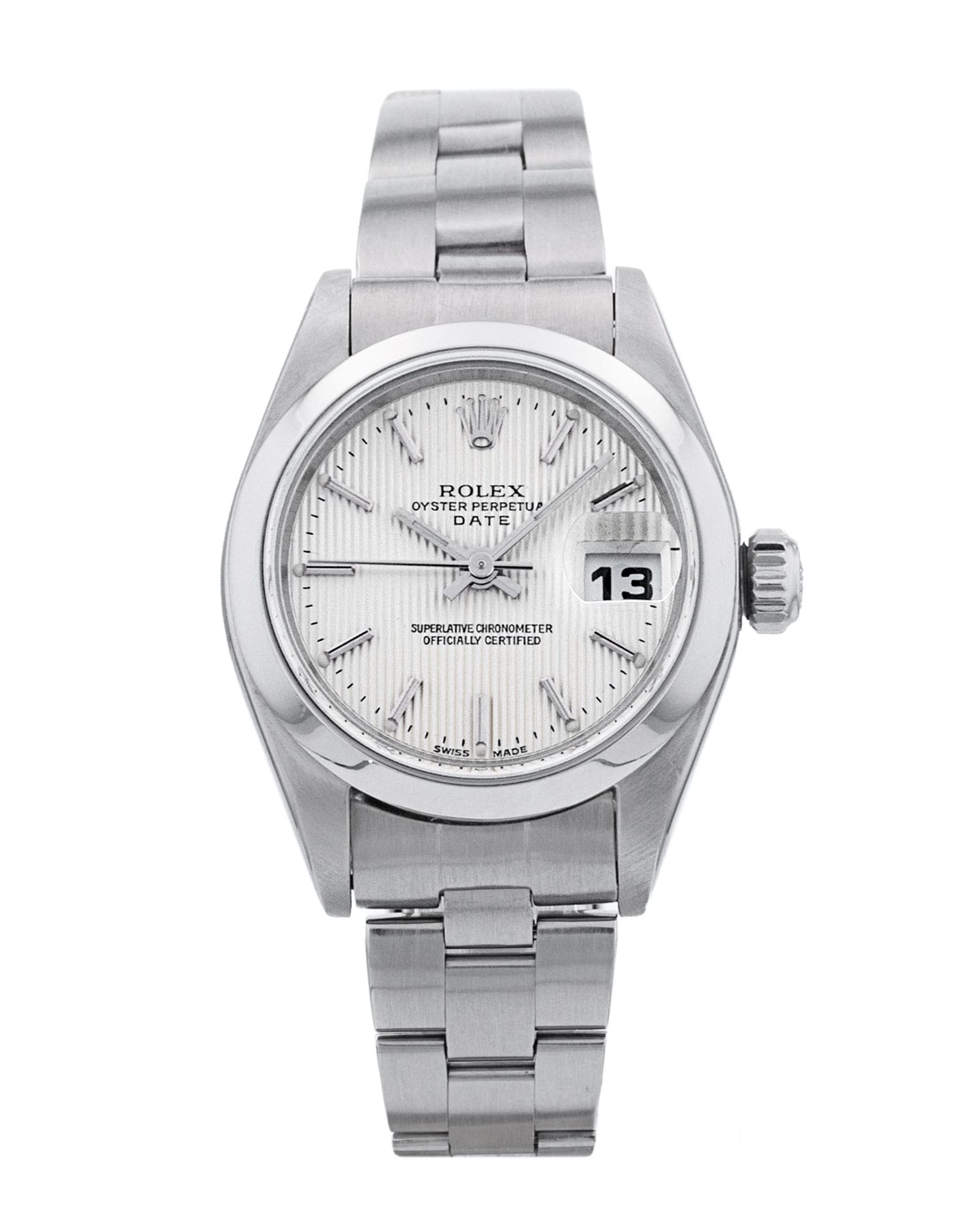 This Rolex Datejust Lady 79160 has a silver tapestry baton dial and a bracelet strap. This Rolex has undergone a thorough inspection of water resistance, accuracy, functionality and condition to determine the level of reconditioning required to meet our strict standards. It has also been referenced against technical documents and manufacturer records where available to ensure authenticity and a clean history. All our watches have a 24-month warranty for your peace of mind. One of our skilled polishing technicians has removed marks on the case and bracelet of this watch, brought about by daily wear and tear, which is why this watch does not come with the remaining manufacturer’s warranty.
