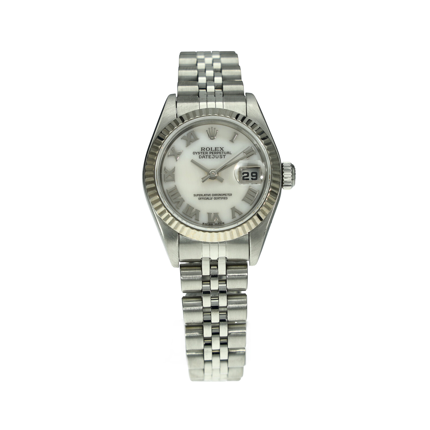 This Rolex Datejust Lady 79174 has a mother of pearl white roman numeral dial and a bracelet strap. This Rolex has undergone a thorough inspection of water resistance, accuracy, functionality and condition to determine the level of reconditioning required to meet our strict standards. It has also been referenced against technical documents and manufacturer records where available to ensure authenticity and a clean history. All our watches have a 24-month warranty for your peace of mind. One of our skilled polishing technicians has removed marks on the case and bracelet of this watch, brought about by daily wear and tear, which is why this watch does not come with the remaining manufacturer’s warranty.