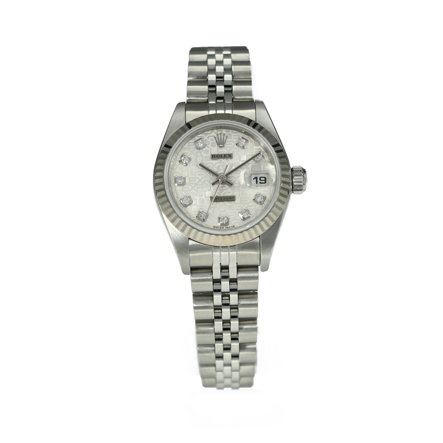 This Rolex Datejust Lady 79174 has a silver jubilee diamond dial and a bracelet strap. This Rolex has undergone a thorough inspection of water resistance, accuracy, functionality and condition to determine the level of reconditioning required to meet our strict standards. It has also been referenced against technical documents and manufacturer records where available to ensure authenticity and a clean history. All our watches have a 24-month warranty for your peace of mind. One of our skilled polishing technicians has removed marks on the case and bracelet of this watch, brought about by daily wear and tear, which is why this watch does not come with the remaining manufacturer’s warranty.