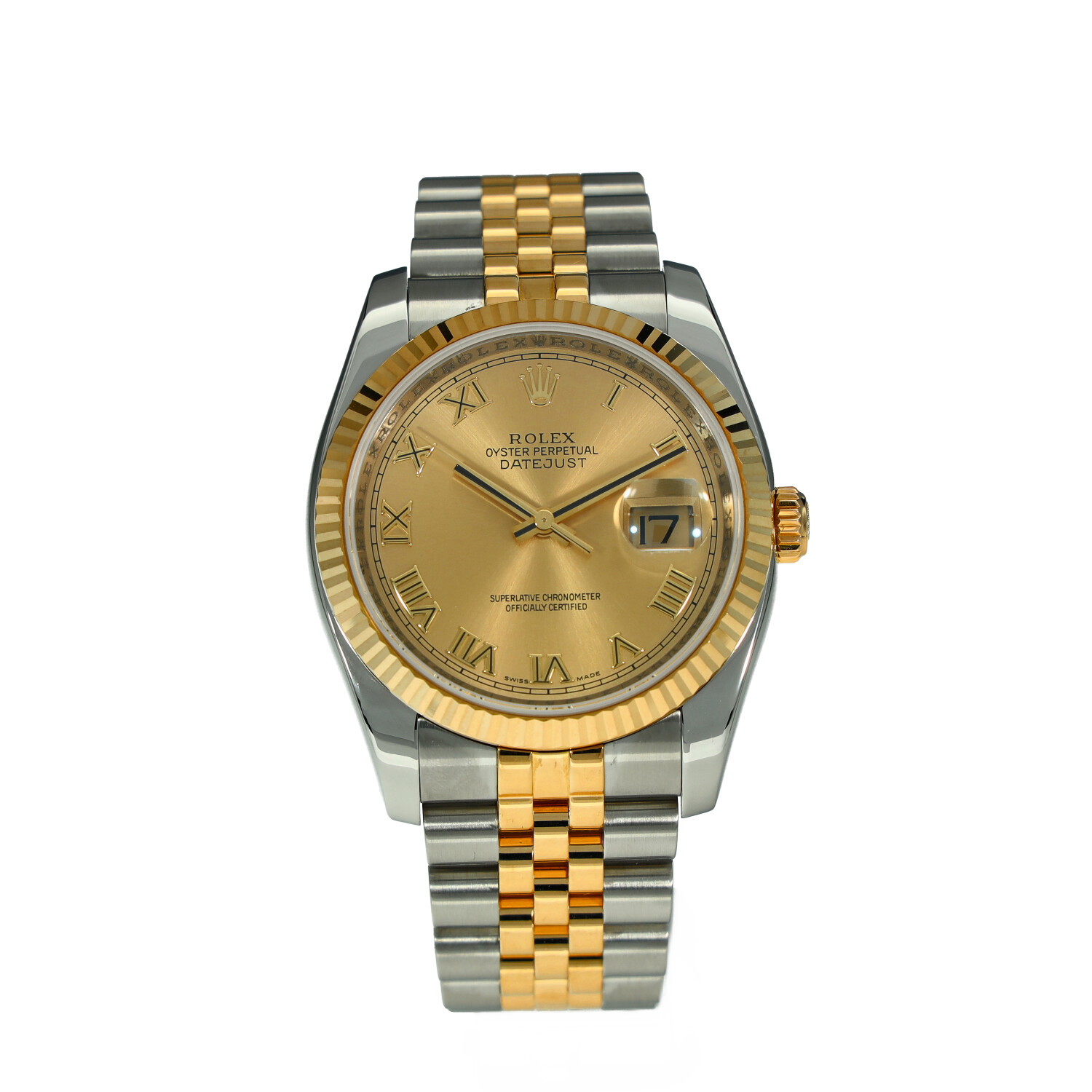 This Rolex Datejust 116233 has a champagne roman numeral dial and a bracelet strap. This Rolex has undergone a thorough inspection of water resistance, accuracy, functionality and condition to determine the level of reconditioning required to meet our strict standards. It has also been referenced against technical documents and manufacturer records where available to ensure authenticity and a clean history. All our watches have a 24-month warranty for your peace of mind. One of our skilled polishing technicians has removed marks on the case and bracelet of this watch, brought about by daily wear and tear, which is why this watch does not come with the remaining manufacturer’s warranty.