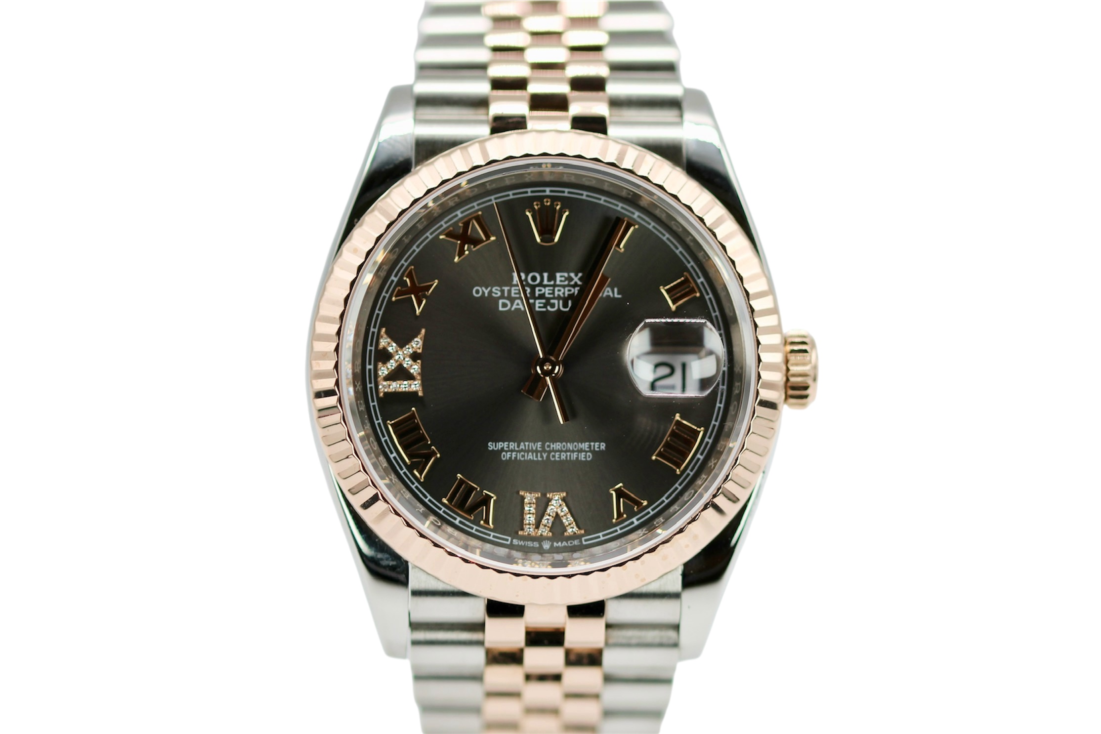 This Rolex Datejust 126231 has a slate roman numeral diamond dial and a bracelet strap. This Rolex has undergone a thorough inspection of water resistance, accuracy, functionality and condition to determine the level of reconditioning required to meet our strict standards. It has also been referenced against technical documents and manufacturer records where available to ensure authenticity and a clean history. All our watches have a 24-month warranty for your peace of mind. One of our skilled polishing technicians has removed marks on the case and bracelet of this watch, brought about by daily wear and tear, which is why this watch does not come with the remaining manufacturer’s warranty.